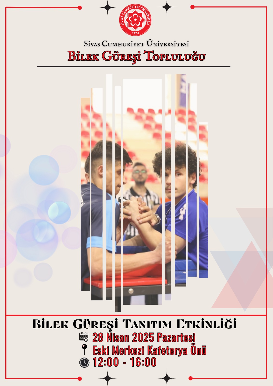 Sivas Cumhuriyet Üniversitesi Bilek Güreşi Topluluğu, sporseverleri heyecan verici bir etkinlikte buluşturuyor. 28 Nisan 2025 Pazartesi günü düzenlenecek tanıtım etkinliği, Eski Merkezi Kafeterya Önü'nde gerçekleştirilecek. Saat 12.00'de başlayacak olan etkinlik, 16.00'ya kadar devam edecek.