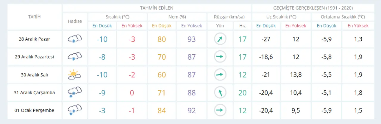 Sivas’ta kış şartları etkisini artırarak sürdürüyor. Meteoroloji’nin paylaştığı 5 günlük hava durumu tahminlerine göre kent genelinde önümüzdeki günlerde düşük sıcaklıklar, zaman zaman kar yağışı ve yüksek nem oranları dikkat çekiyor. Özellikle gece saatlerinde don ve buzlanma riski öne çıkarken, vatandaşların tedbirli olması isteniyor.