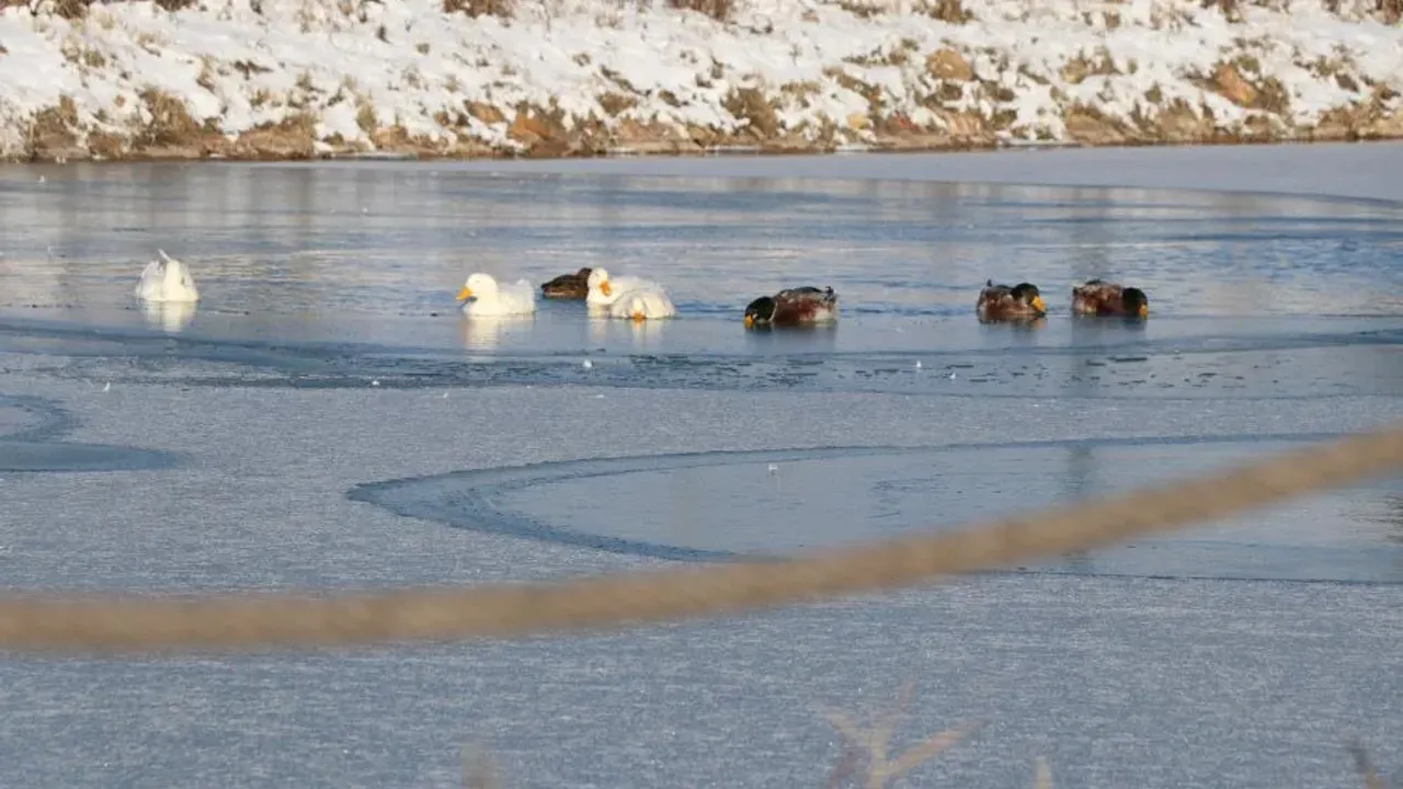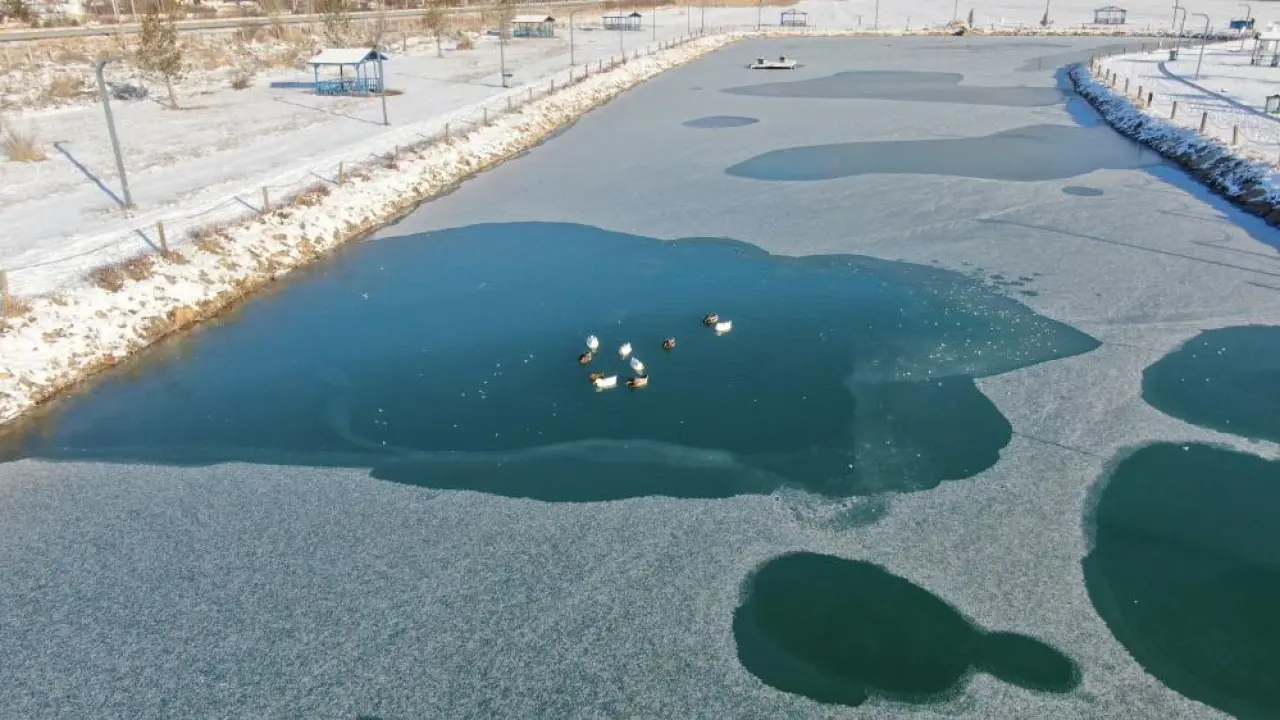 Sivas Cumhuriyet Üniversitesi yerleşkesinde bulunan Hasbahçe’deki yapay gölet, dondurucu havanın etkisiyle büyük oranda buz tuttu. Göletin yüzeyi beyaz bir örtüyle kaplanırken, içerisinde bulunan ördekler suyun donmayan kısımlarında yüzerek hayatta kalmaya çalıştı. Buz tutan alanlar nedeniyle göletin diğer bölümlerine geçemeyen ördeklerin bu çabası, görenlerin ilgisini çekti.