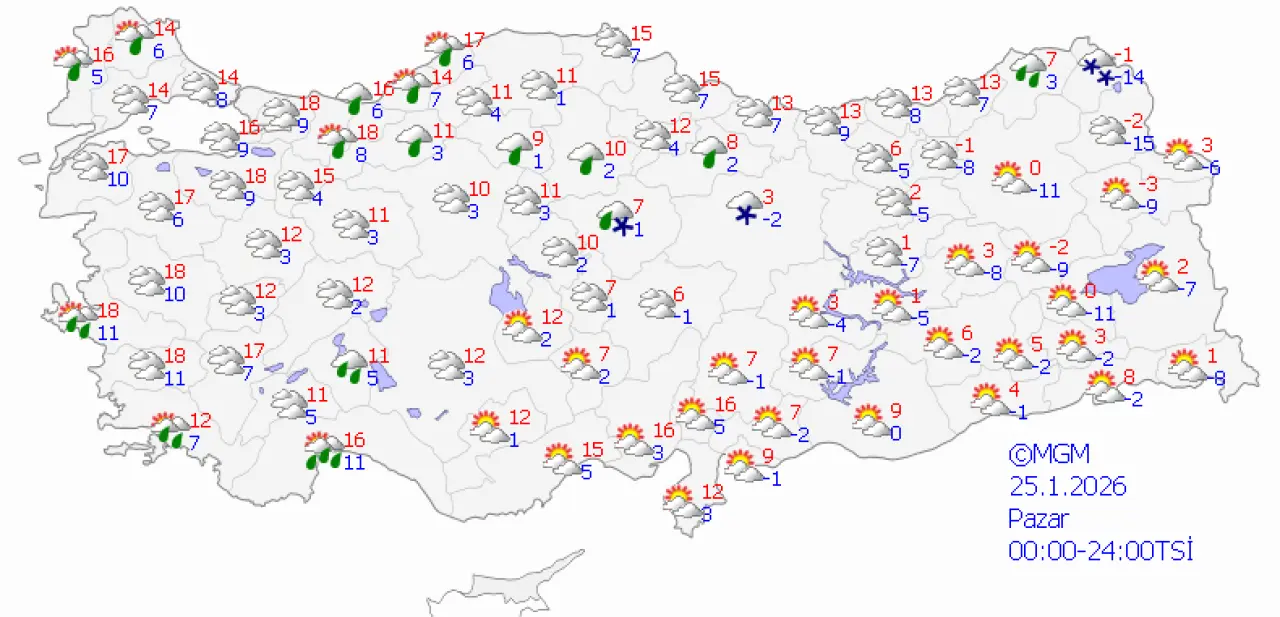 Meteoroloji Genel Müdürlüğü tarafından yayımlanan son hava tahmin raporuna göre, 25 Ocak Pazar günü Sivas'ta kar yağışı bekleniyor. Harita verilerine göre şehir genelinde etkili olması öngörülen kar yağışı, özellikle yüksek kesimlerde ve köy yollarında ulaşımı zorlaştırabilir. Pazar gününü dışarıda geçirmeyi planlayan vatandaşların, dondurucu soğuklara ve yağışa karşı hazırlıklı olmaları tavsiye ediliyor. Sivas merkezde kar yağışının gün boyu aralıklarla devam edeceği tahmin ediliyor.