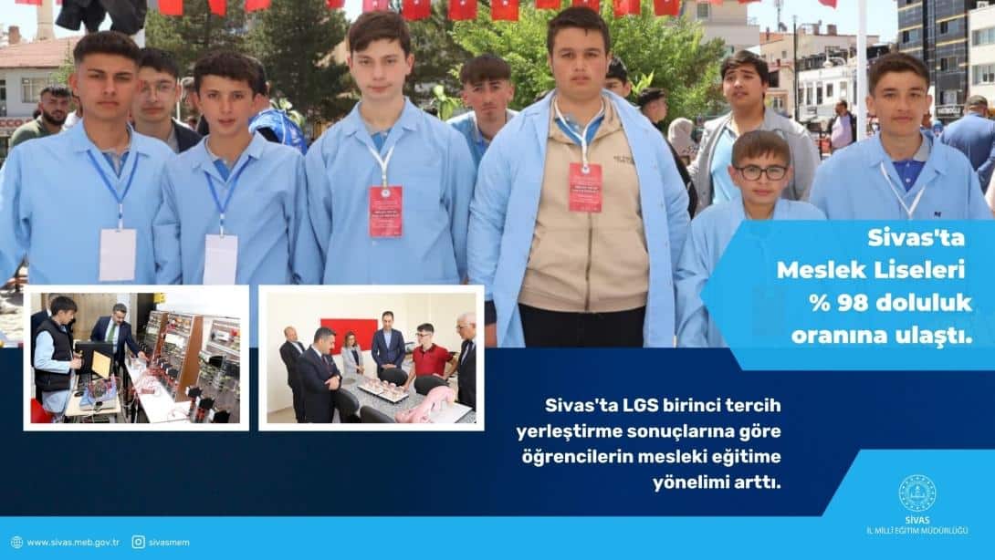 Millî Eğitim Bakanlığının politikaları doğrultusunda Sivas'ta mesleki eğitim alanında önemli çalışmalar yürütülüyor. Rehberlik ve tanıtım faaliyetleri ile birlikte okul-sanayi işbirliklerinin artırılması, yürütülen proje ve çalışmalar, sektör işbirliklerinin sağlanması ve mezun olan öğrencilere iş imkânlarının sunulması öğrencilerin mesleki eğitime olan ilgisini önemli ölçüde artırdı.
