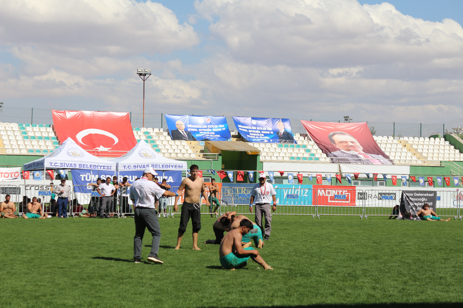 Sivas Belediyesi’nin ev sahipliğiyle 3 Eylül 2025 Çarşamba günü Muhsin Yazıcıoğlu Spor Kompleksi’nde gerçekleştirilen güreşler, saat 12.00’de başladı ve gün boyu devam etti. Minikler, yıldızlar ve büyükler kategorilerinde kispet giyen pehlivanlar, rakiplerini yenmek için er meydanında ter döktü. Coşkulu kalabalık, peşrevlerden oyunlara kadar her adımı büyük bir heyecanla takip etti.