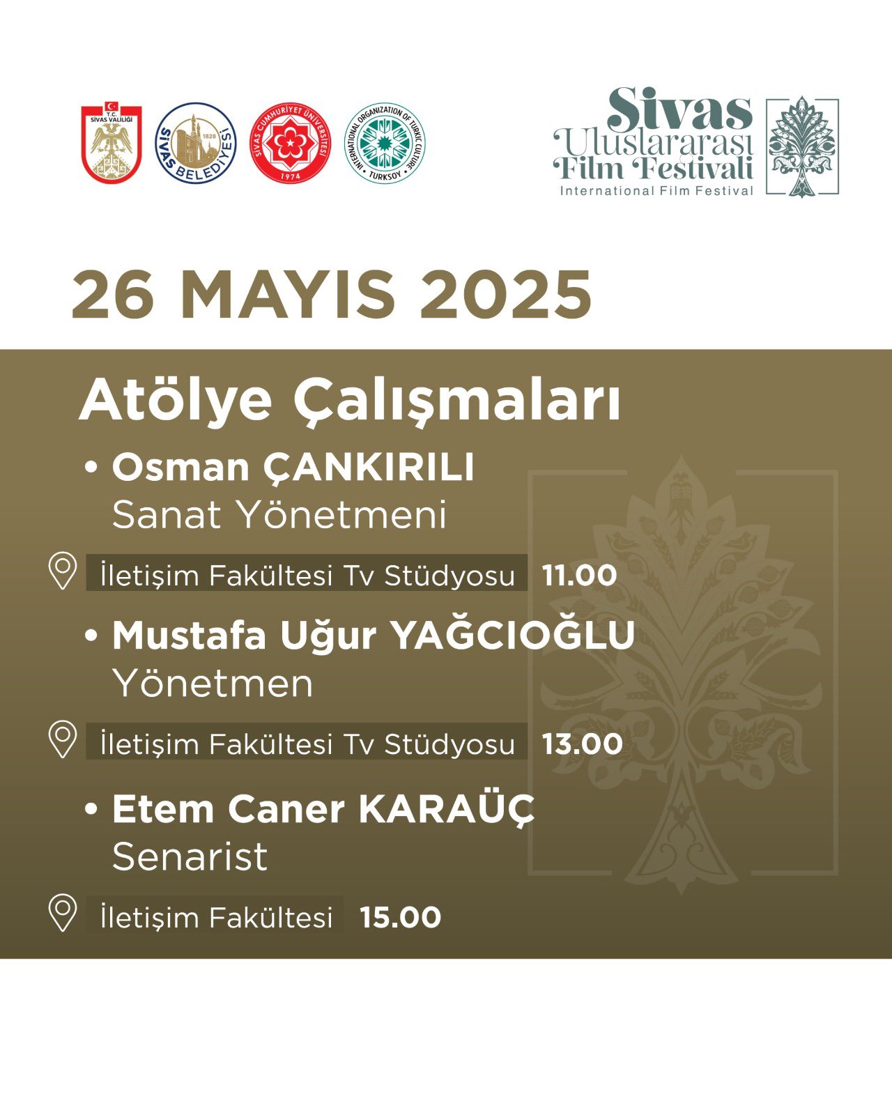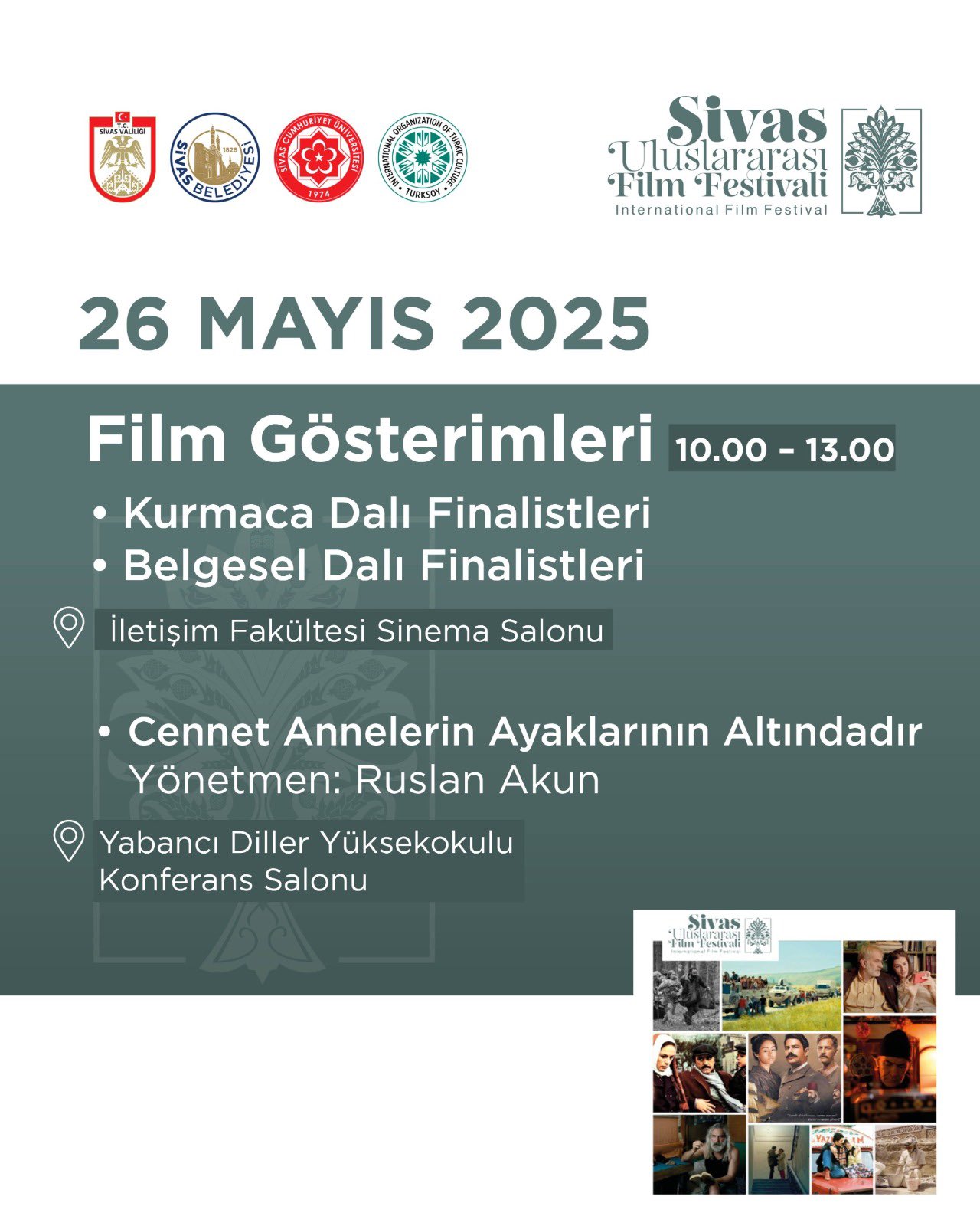 Festivalin ilk gün programlarının yarın başlaması ve Sivaslılara sinema, müzik ve sanat dolu anlar yaşatması bekleniyor. Tüm etkinliklerin ücretsiz olması, her kesimden vatandaşın bu kültürel zenginliğe kolayca erişebilmesine olanak tanıyacak. Sivas Uluslararası Film Festivali'nin ikinci yılında da şehre damgasını vurması ve gelenekselleşerek Sivas'ın kültür sanat takviminde önemli bir yer edinmesi hedefleniyor.