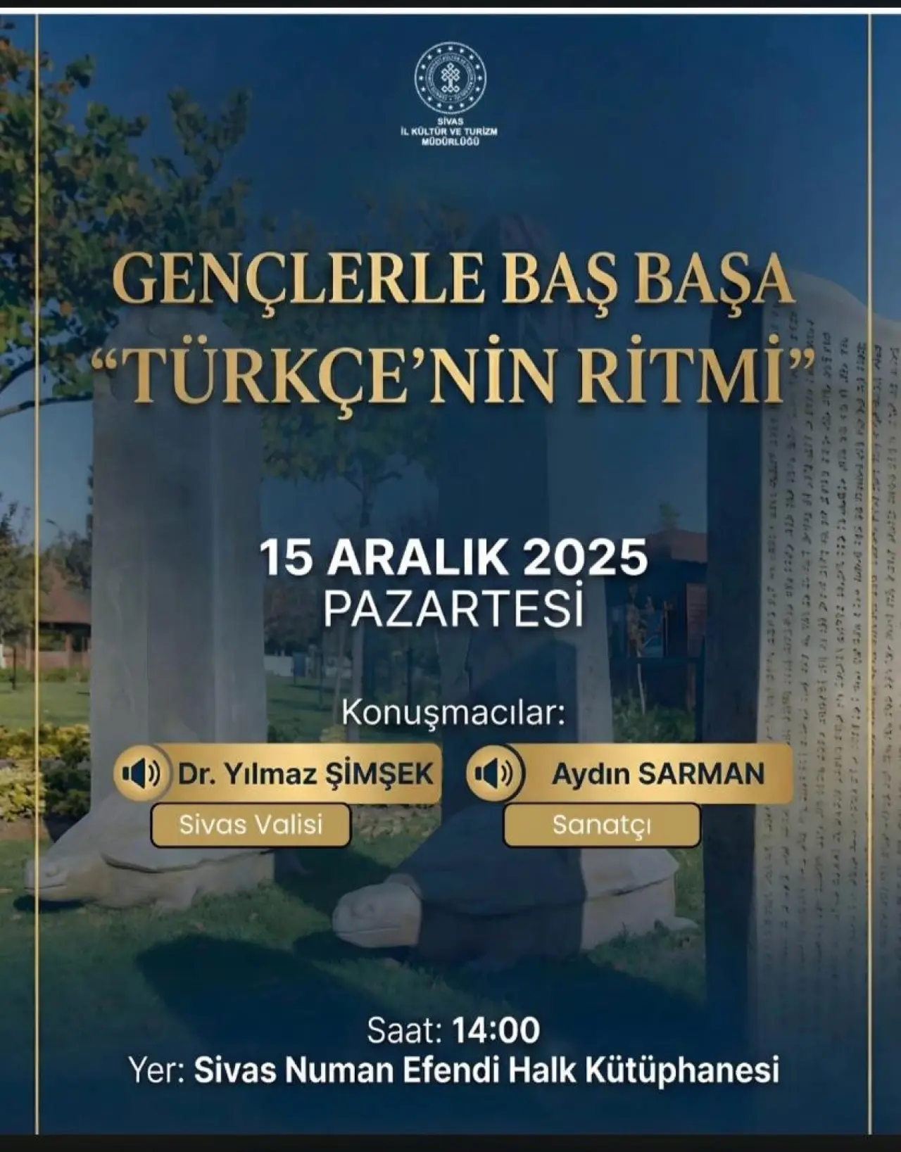 “Gençlerle Baş Başa: Türkçe’nin Ritmi” başlığıyla gerçekleştirilecek programda, Türkçenin zenginliği, kültürel derinliği ve sanatla olan bağı ele alınacak. Etkinlik, bu gün saat 14.00’te, Sivas Numan Efendi Halk Kütüphanesi ev sahipliğinde yapılacak. Programın konuşmacıları arasında Sivas Valisi Dr. Yılmaz Şimşek ile sanatçı Aydın Sarman yer alacak.