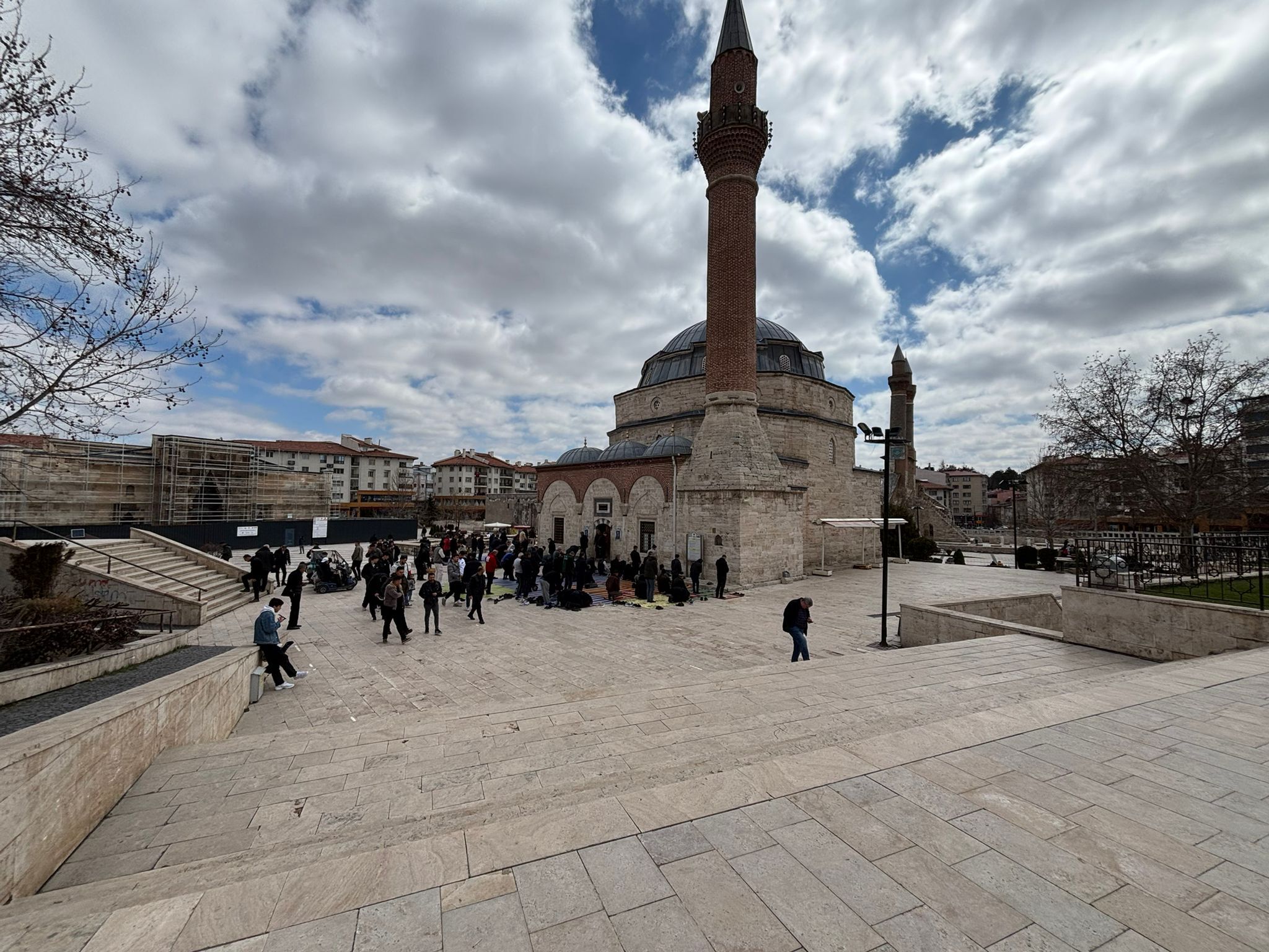 Sivas'ın tarihi ve merkezi camilerinde bugün yine tanıdık manzaralar vardı. Caminin iç kapasitesi dolunca, içeri giremeyen vatandaşlar seccadelerini yanlarında getirerek bahçelere, avlulara ve hatta kaldırımlara serdi. Omuz omuza saf tutan yüzlerce Sivaslı, cami sınırlarını aşarak sokaklara kadar taştı. Baharın ilk sıcak günlerini ibadetle karşılayan vatandaşların oluşturduğu bu devasa saflar, havadan bakıldığında adeta bir inanç köprüsü gibi göründü. Namaz vaktinde cami bahçelerinde dahi yer bulmak neredeyse imkansız hale geldi.