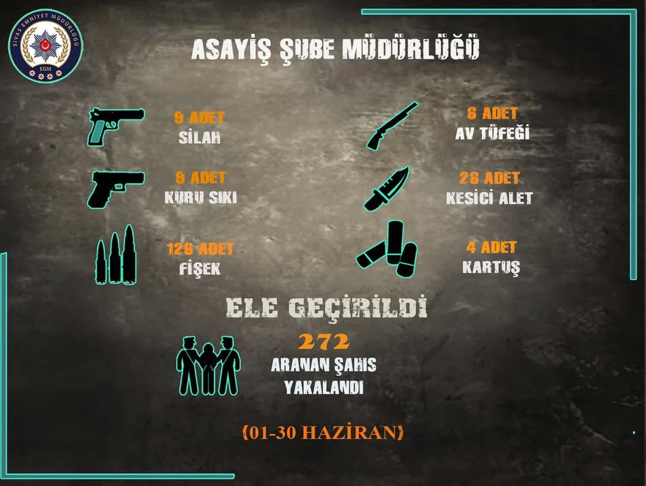Sivas İl Emniyet Müdürlüğü ekiplerince Haziran ayı içerisinde yapılan operasyonlarda çok sayıda suç unsuru ele geçirilirken çeşitli suçlardan aranan 272 şahıs da yakalandı.