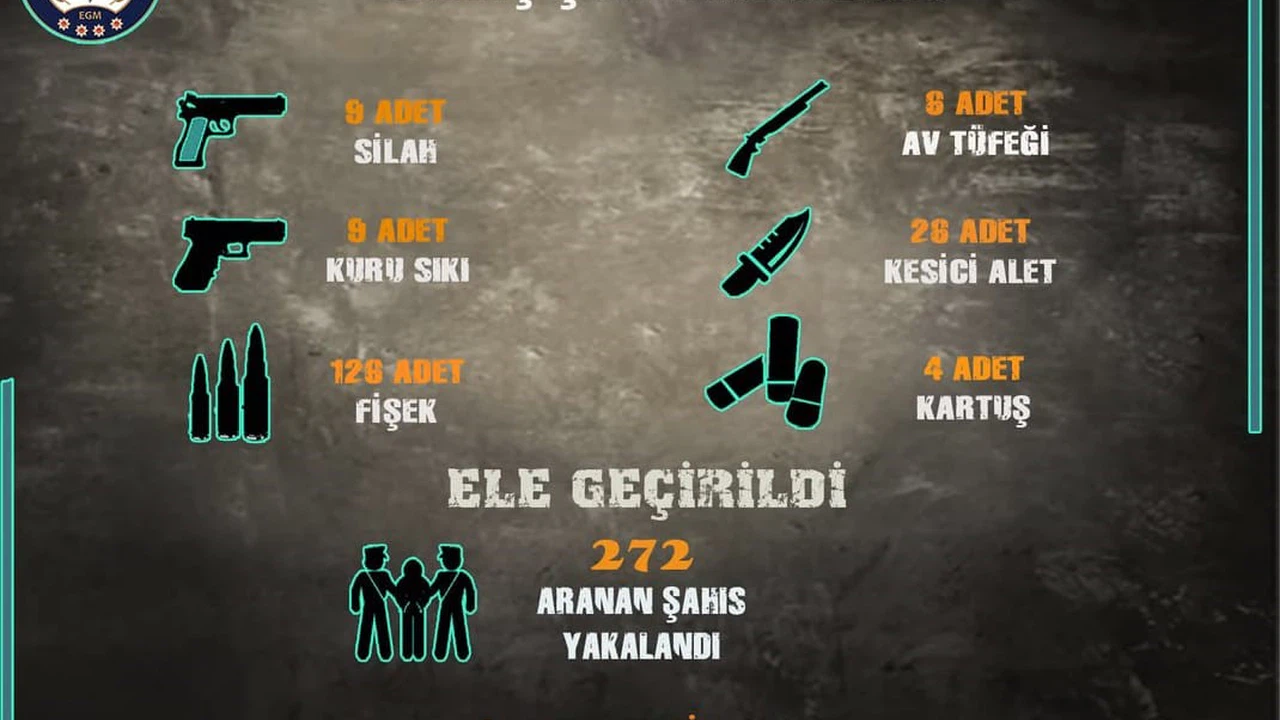 Asayiş Şube Müdürlüğü ekiplerince gerçekleştirilen operasyonlarda; 9 adet silah, 6 adet av tüfeği, 9 adet kurusıkı tabanca, 128 adet fişek, 26 adet kesici alet ve 4 adet kartuş ele geçirildi. Ayrıca, çeşitli suçlardan aranan 272 şahıs da yakalandı.