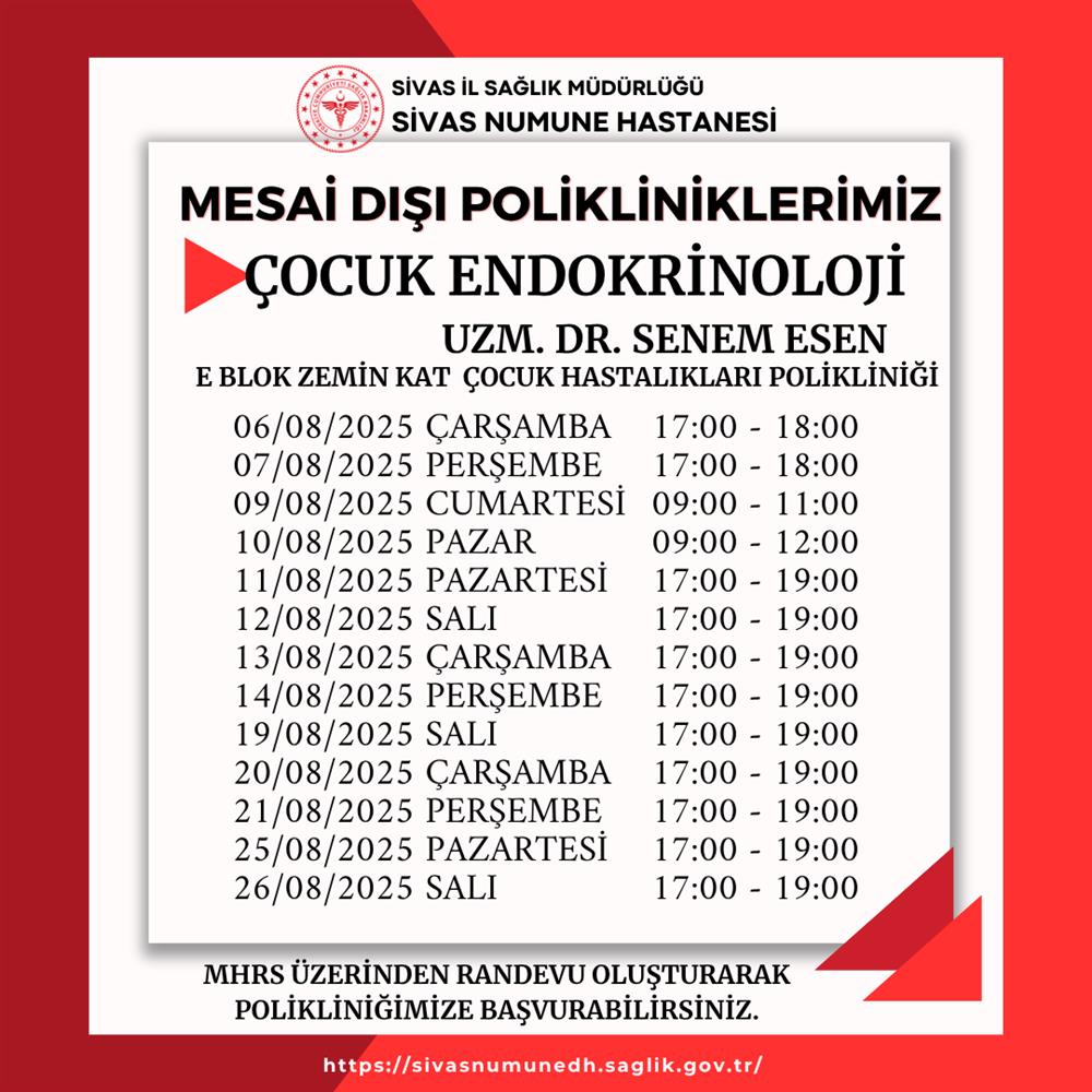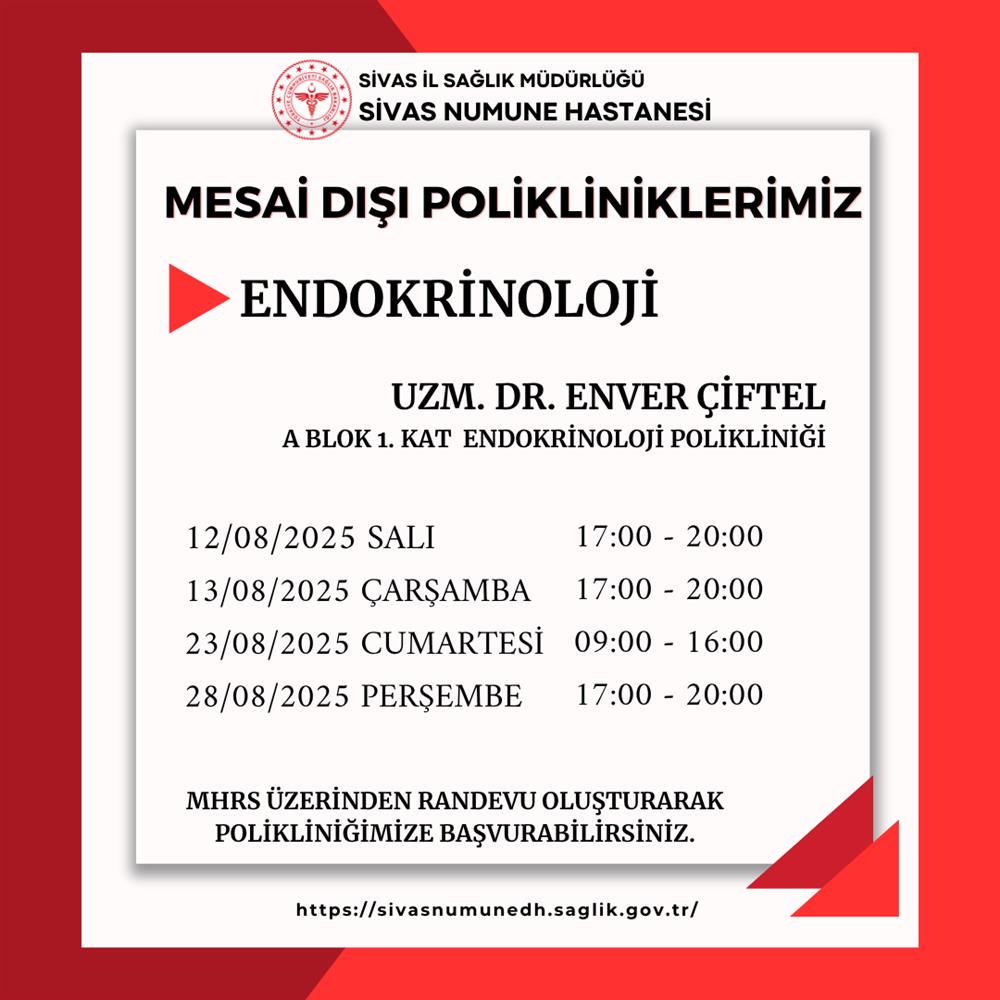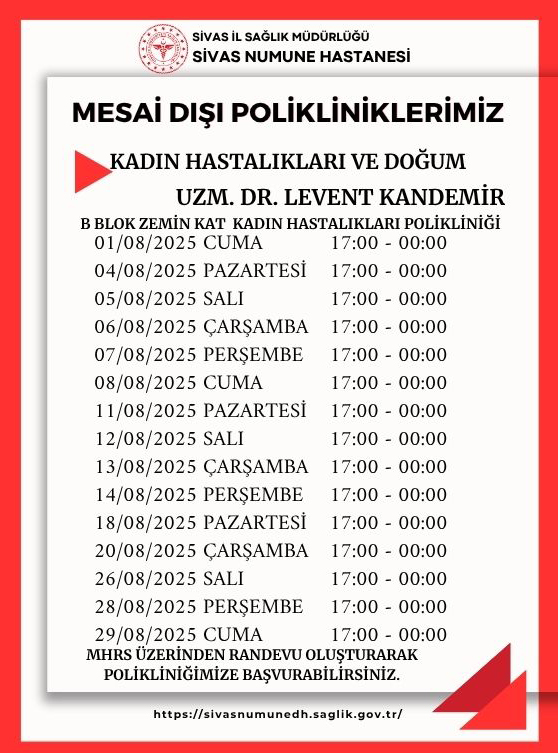 Sivas Numune Hastanesi, mesai saatleri içerisinde hastaneye gitmekte zorlanan çalışanlar, öğrenciler ve Sivaslı vatandaşlar için büyük bir kolaylık sağlayan mesai dışı poliklinik hizmetlerinin Ağustos 2025 takvimini duyurdu. Kadın Doğum'dan Göz Hastalıkları'na kadar 6 farklı kritik branşta, akşam saatlerinde ve hafta sonlarında uzman hekimlerden randevu alınabilecek.