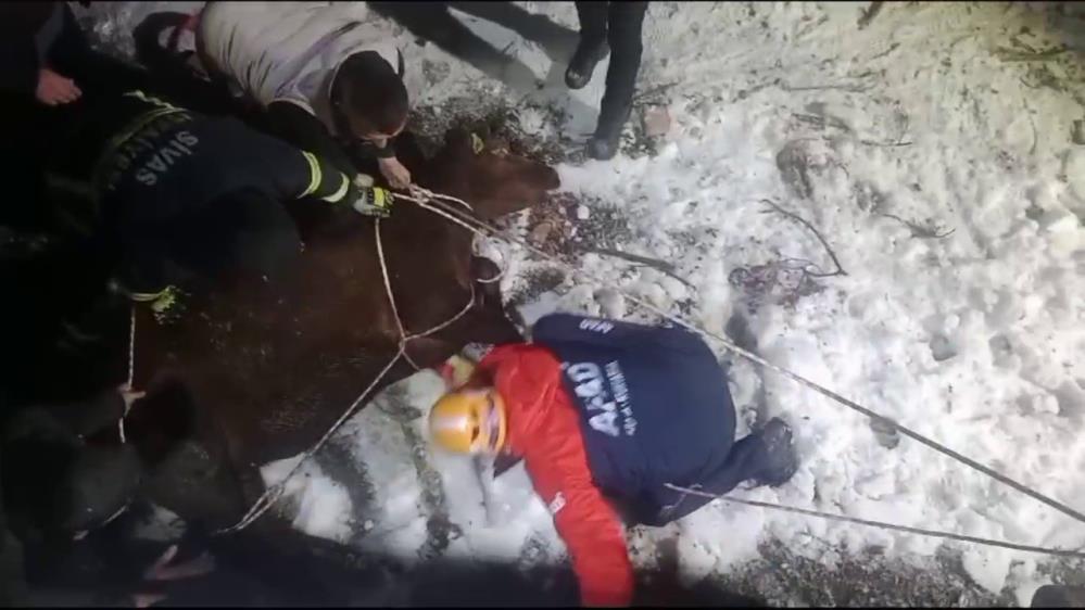 Çevredeki vatandaşların durumu fark etmesi üzerine olay yerine AFAD ve Sivas Belediyesi itfaiye ekipleri sevk edildi. Kısa sürede olay yerine ulaşan ekipler, halatlar yardımıyla ineği düştüğü havuzdan çıkardı. Çalışmaların ardından kurtarılan inek, sahibine teslim edildi.