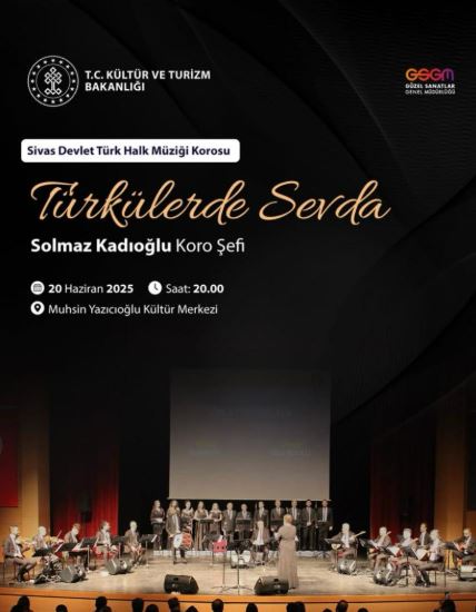 Sivas'ın kültür sanat hayatına yön veren Sivas Devlet Türk Halk Müziği Korosu, Haziran ayını unutulmaz bir konserle taçlandırmaya hazırlanıyor. Koro Şefi Solmaz Kadıoğlu yönetimindeki dev kadro, "Türkülerde Sevda" temalı özel bir repertuvarla 20 Haziran Cuma akşamı Sivaslı sanatseverlerle buluşacak.