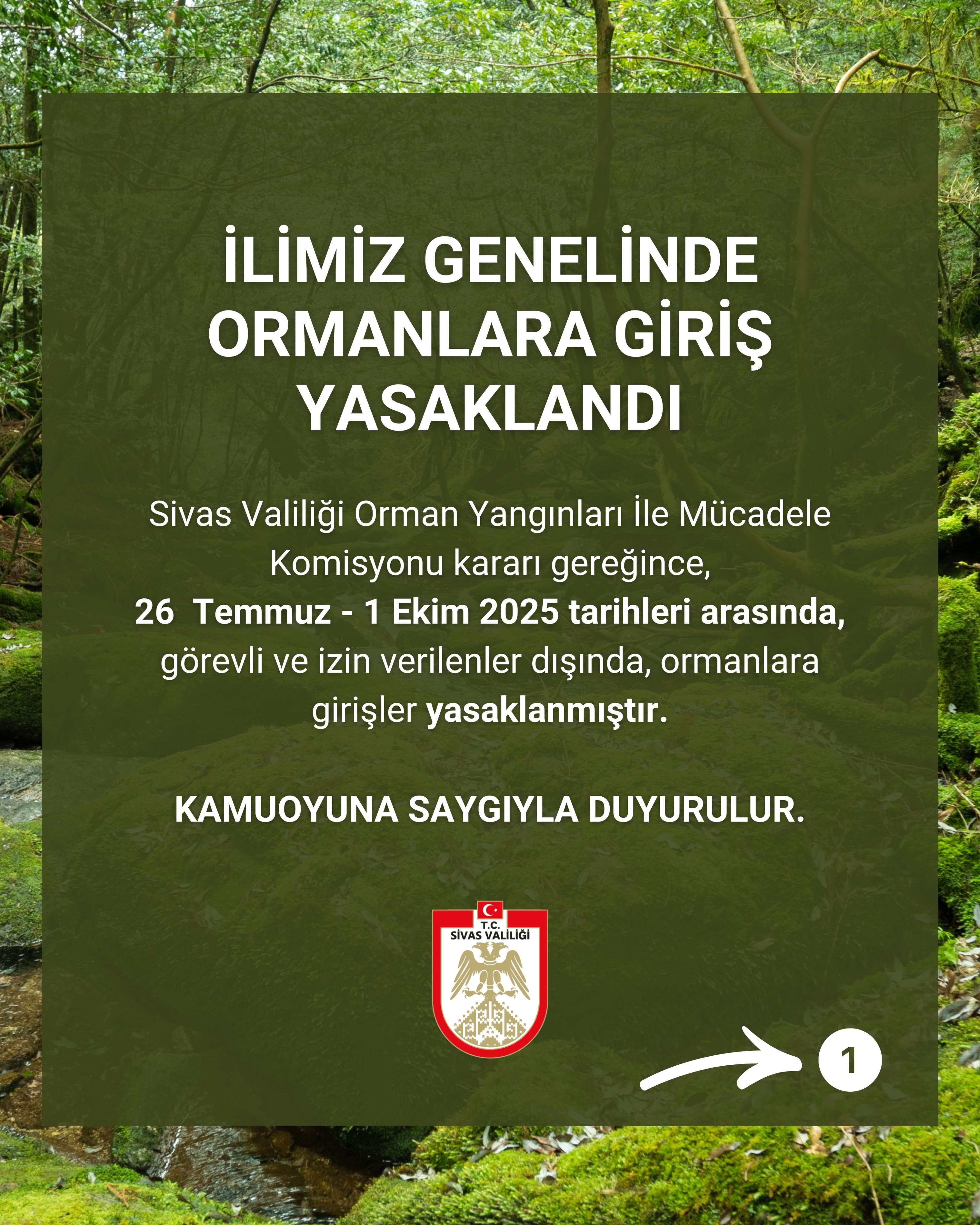 Sivas Valiliği, orman yangınlarıyla mücadele kapsamında alınan yeni tedbirler doğrultusunda, il genelindeki tescilli ormanlık alanlara 26 Temmuz - 1 Ekim 2025 tarihleri arasında girişi yasakladı. Yasak, Orman İdaresinden ihale veya tahsisli iş alanlarında çalışanlar ile yetkililer haricindeki tüm vatandaşları kapsıyor.