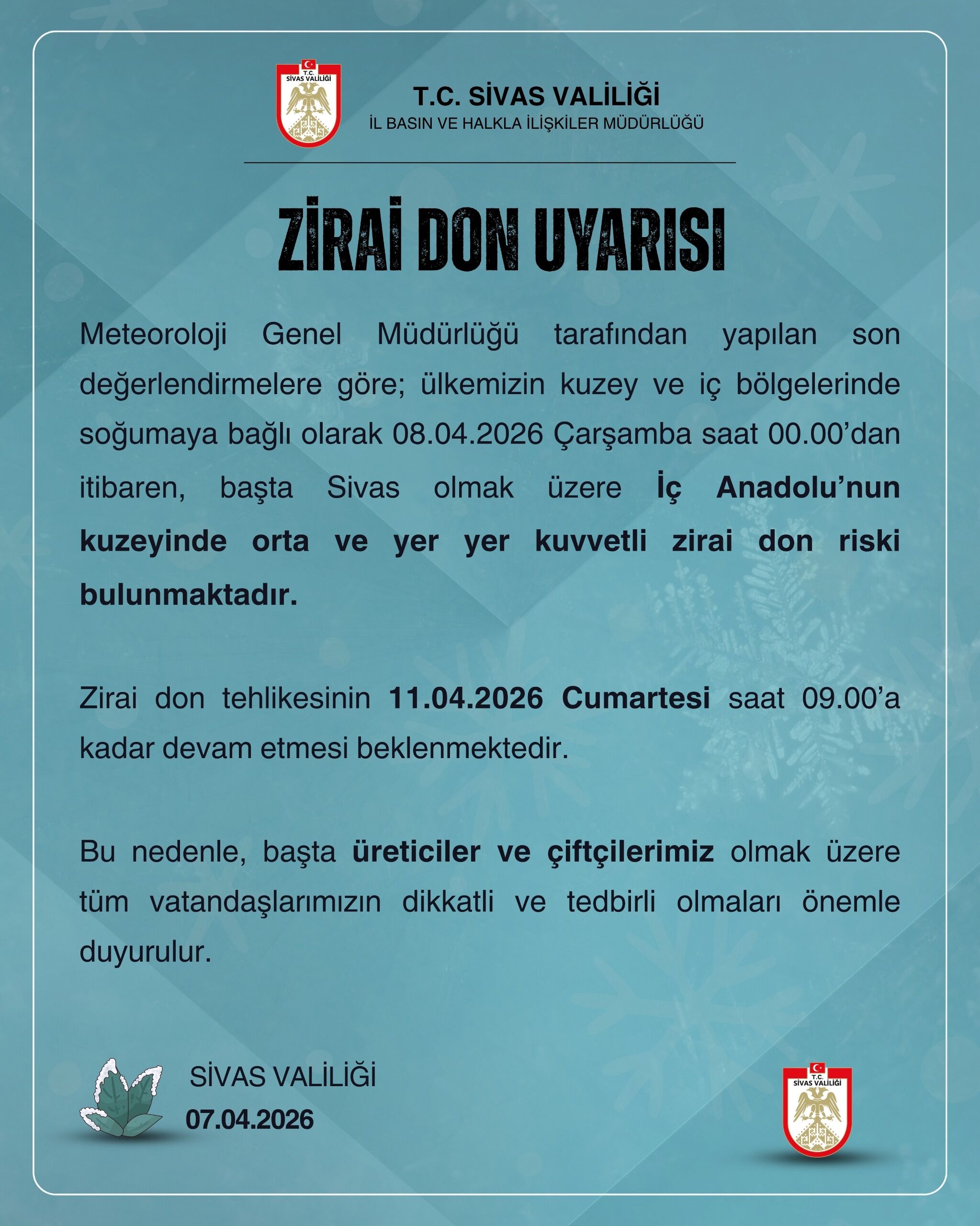 Sivas Valiliği, başta üreticiler ve çiftçiler olmak üzere tüm vatandaşlara çağrıda bulundu. Zirai don olayının tarımsal ürünlerde ciddi zararlara yol açabileceği belirtilirken, gerekli önlemlerin alınması gerektiği vurgulandı.