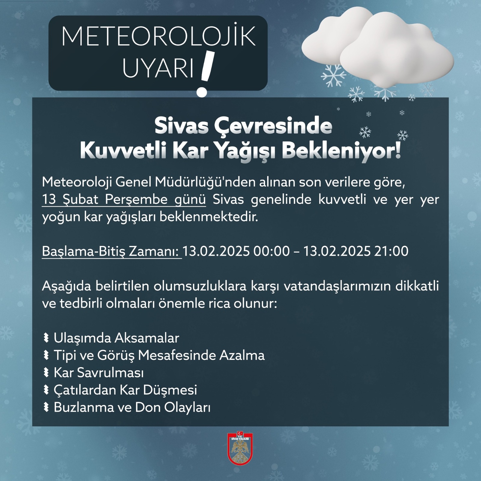 Meteoroloji Genel Müdürlüğü'nden yapılan açıklamaya göre, 13 Şubat Perşembe itibarıyla Sivas genelinde sağanak kar yağışı etkili olacak. Yetkililer, yoğun kar yağışı nedeniyle ulaşımda aksamalar, buzlanma ve don olaylarına karşı vatandaşları uyardı.