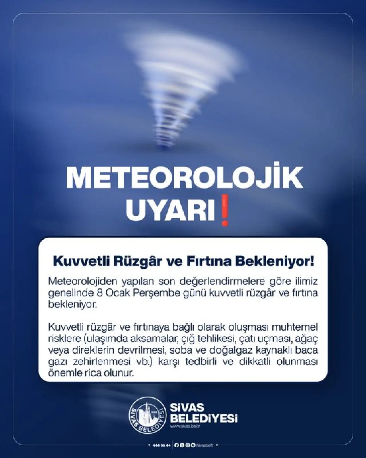 Sivas’ta kuvvetli rüzgâr ve fırtına uyarısı geldi. Sivas Belediyesi, resmi sosyal medya hesapları üzerinden yaptığı paylaşımla vatandaşları yaklaşan olumsuz hava koşullarına karşı dikkatli olmaya çağırdı. Meteoroloji Genel Müdürlüğü’nün son değerlendirmelerine dayandırılan açıklamada, 8 Ocak Perşembe günü kent genelinde kuvvetli rüzgâr ve yer yer fırtına beklendiği bildirildi.