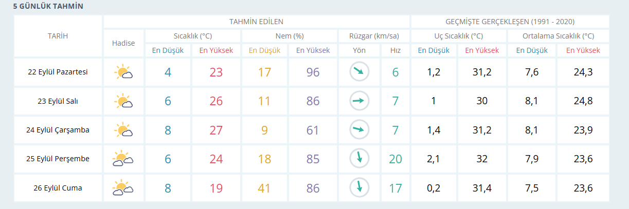 23 Eylül Salı: En yüksek 26°C, en düşük 6°C.