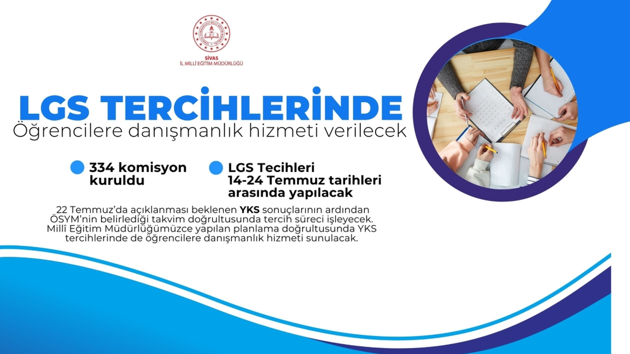 Sivas'ta, 22 Temmuz'da açıklanması beklenen YKS sonuçlarının ardından ÖSYM'nin belirlediği takvim doğrultusunda tercih süreci işleyecek. Millî Eğitim Müdürlüğümüzce yapılan planlama doğrultusunda YKS tercihlerinde de öğrencilere danışmanlık hizmeti sunulacak.