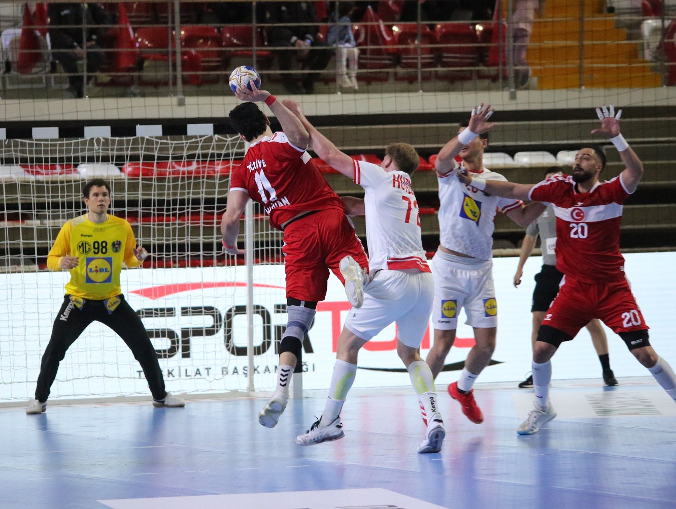 Sivas'ta milli heyecan adeta tavan yaptı! A Milli Erkek Hentbol Takımımız, EHF EURO 2026 Elemeleri'nin zorlu parkurunda Avusturya Milli Takımı ile kozlarını paylaşırken, Sivas Valisi Sayın Yılmaz Şimşek de bu kritik ve heyecan dolu mücadeleyi tribünden takip ederek Ay-Yıldızlılarımıza güçlü bir moral verdi.