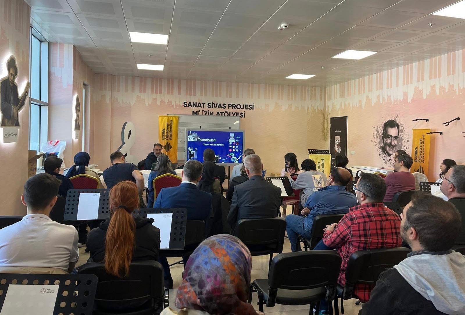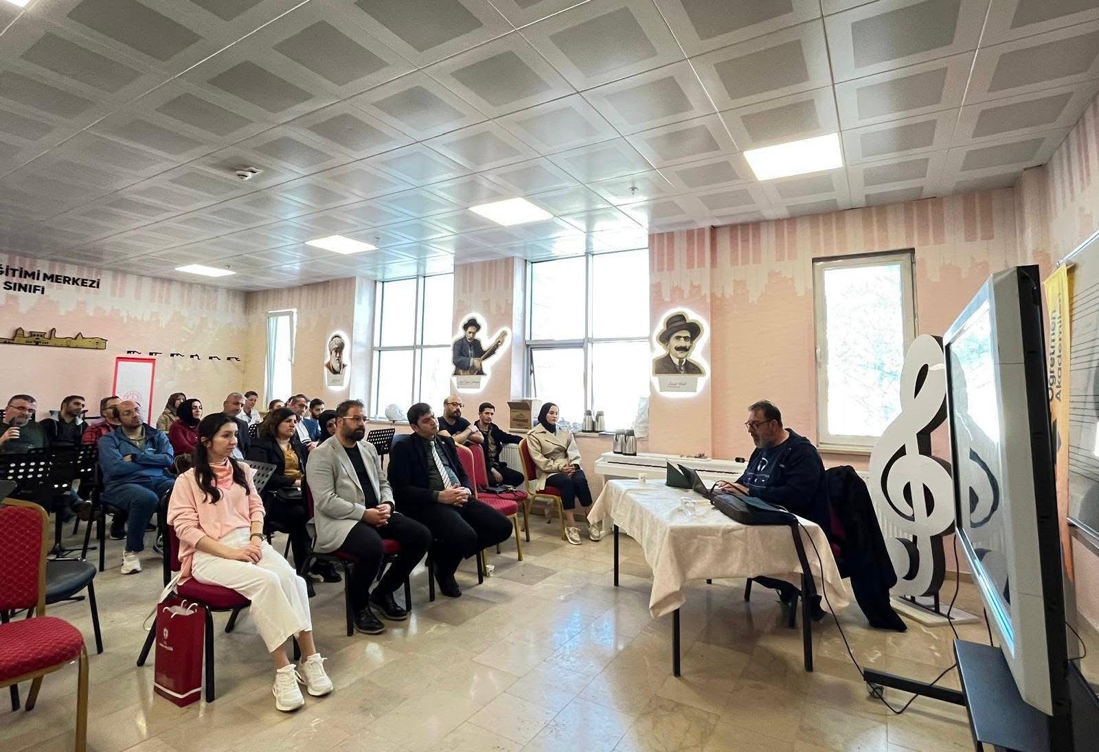 "Müzik Teknolojileri" konulu söyleşide Öğr. Gör. Kürşat Taydaş, öğretmenlere müziğin teknolojiyle olan yakın ilişkisini çarpıcı örneklerle aktardı. Yapay zekânın müzik dünyasına getirdiği yenilikler ve etkileri üzerinde duran Taydaş, dijitalleşmenin müzik üretimi, dağıtımı ve tüketimi üzerindeki derin etkilerini de detaylı bir şekilde ele aldı.