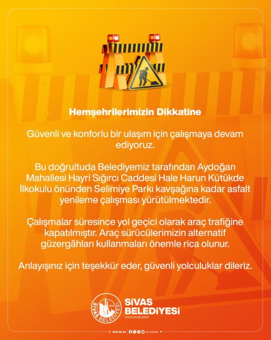 Sivas Belediyesi, şehir içi ulaşımda güvenliği ve konforu artırma hedefiyle başlattığı çalışmalar kapsamında, Aydoğan Mahallesi'nde önemli bir güzergahın geçici olarak trafiğe kapatıldığını duyurdu. Sürücülerin mağduriyet yaşamaması için alternatif yolları kullanmaları istendi.