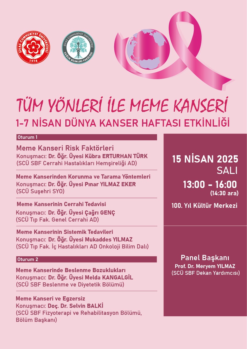 Sivas Cumhuriyet Üniversitesi (SCÜ) Sağlık Bilimleri Fakültesi, 1-7 Nisan Dünya Kanser Haftası etkinlikleri kapsamında son derece önemli bir panele ev sahipliği yapıyor. Bugün (15 Nisan Salı) öğleden sonra gerçekleştirilecek olan "Tüm Yönleri ile Meme Kanseri" başlıklı panelde, alanında uzman isimler konuyu A'dan Z'ye ele alacak.