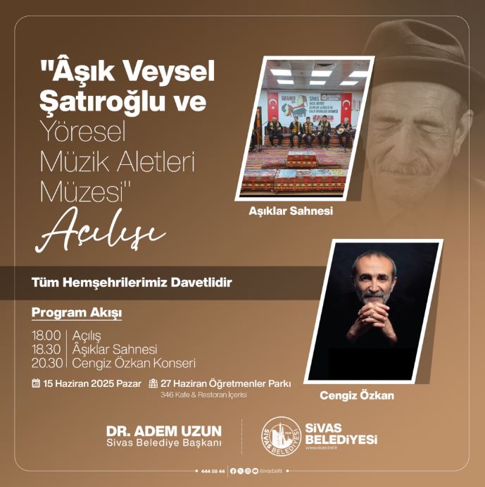 Sivas, "uzun ince bir yolda" yürüyen büyük halk ozanı Âşık Veysel Şatıroğlu'nun ölümsüz mirasına ev sahipliği yapacak kalıcı bir esere kavuşuyor. Sivas Belediyesi, yapımını tamamladığı "Âşık Veysel Şatıroğlu ve Yöresel Müzik Aletleri Müzesi"nin kapılarını, unutulmaz bir programla sanatseverlere açıyor.