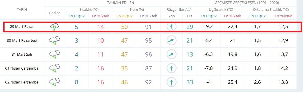 Sivas'ta 29 Mart Pazar günü gökyüzü kapalı ve ıslak bir güne uyanıyor. Meteorolojik verilere göre Pazar günü şehir genelinde sağanak yağış hakim olacak. Günün en yüksek sıcaklığı 14 derece olarak ölçülürken, gece saatlerinde termometreler 5 dereceye kadar gerileyecek. Özellikle nem oranının yüzde 91 seviyelerine kadar çıkması, yağışın etkisini gün boyu hissettireceğinin en büyük kanıtı. Pazar gezmesi planlayan Sivaslıların şemsiyelerini yanlarına almadan evden çıkmaması gerekiyor.