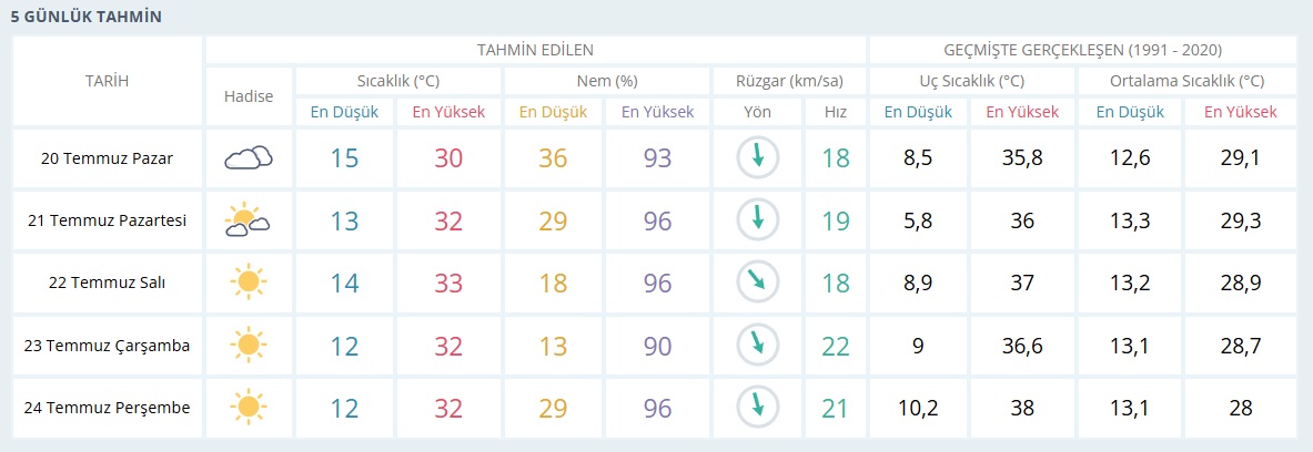 23 Temmuz Çarşamba ve 24 Temmuz Perşembe: Hafta ortasından itibaren bol güneşli ve sıcak hava etkisini koruyacak. Her iki günde de en yüksek sıcaklığın 32°C, en düşük sıcaklığın ise 12°C olması tahmin ediliyor.