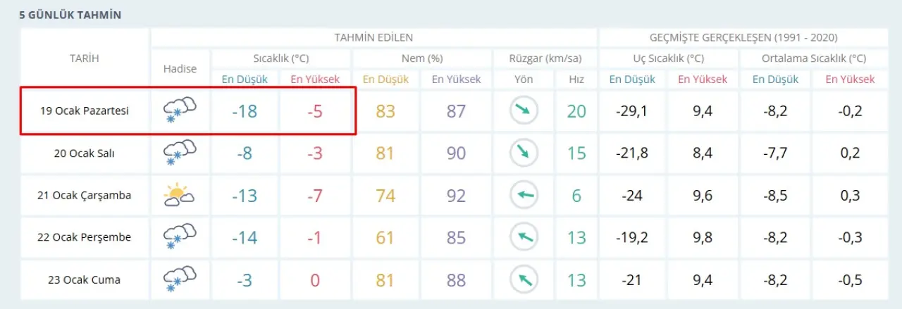 19 Ocak Pazartesi günü Sivas’ta ölçülmesi beklenen en düşük hava sıcaklığı sıfırın altında 18 derece olarak tahmin ediliyor. Gün içerisinde güneşin yüzünü pek göstermeyeceği kentte, en yüksek sıcaklığın ise yine sıfırın altında 5 derece civarında seyretmesi bekleniyor. Geçmiş yıllardaki (1991-2020) ortalamalara bakıldığında en düşük sıcaklığın eksi 8,2 olduğu görülürken, bu Pazartesi yaşanacak eksi 18 derecelik tahmin, Sivaslıların oldukça çetin bir gün geçireceğini kanıtlıyor.