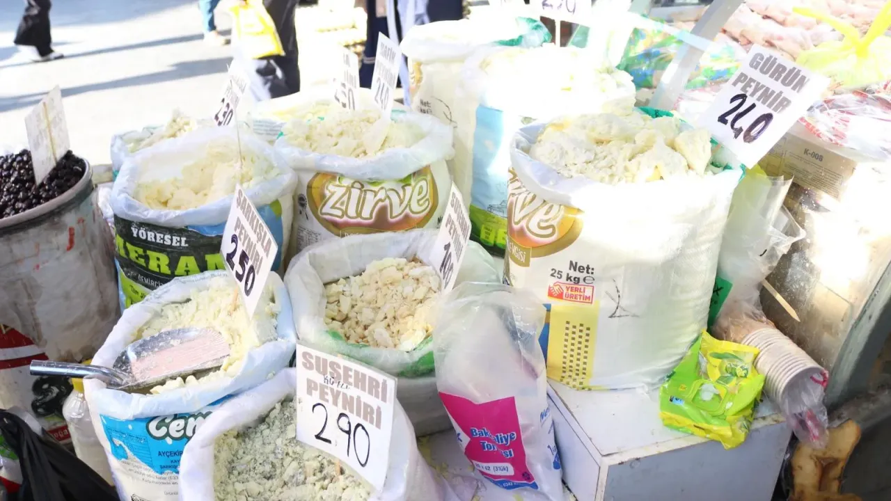 Sivas’a özgü ve çevre illerden gelen birçok meşhur yöresel peynir çeşidi, kiloluk çuvallarda ve bidonlarda satışa sunuluyor. Pazarda sergilenen etiketler, fiyatların geldiği son noktayı çarpıcı bir şekilde gözler önüne seriyor.