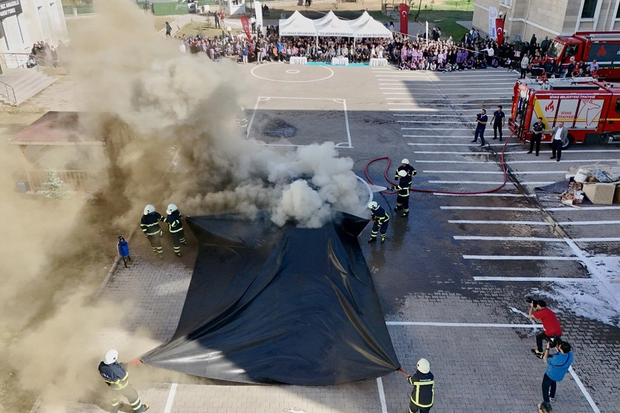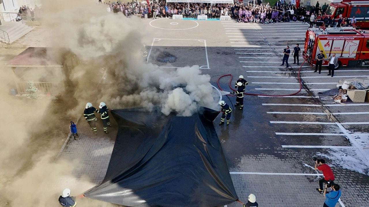 Sivas’ta İtfaiye Haftası dolayısıyla düzenlenen tatbikat, izleyenlere adeta bir kurtarma operasyonunu yaşattı. Gerçek olayları aratmayan sahneler, öğrencilerden büyük alkış aldı.