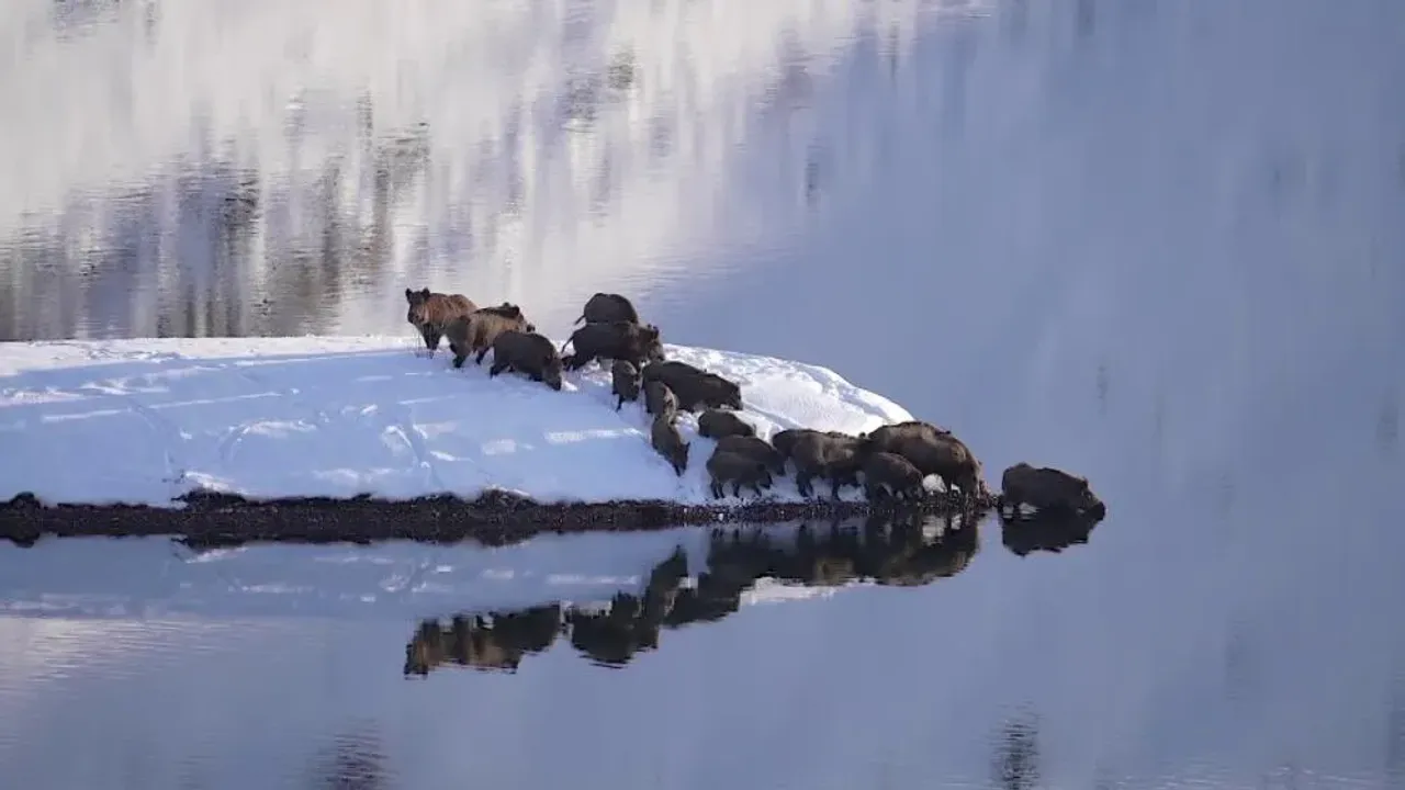 Barajın bazı bölümleri buz tutmuş, bazı kısımları ise tamamen açıktı. Domuz sürüsü, tepeyi dolaşarak uzun yolu tercih etmek yerine, doğrudan suyun içinden karşıya geçmeye karar verdi. Sürünün en önündeki domuz, hiç tereddüt etmeden buz gibi suya girdi. Ardından yaklaşık 40 hayvandan oluşan sürü, tek sıra halinde yüzmeye başladı. Eksi 20 derece soğukta gerçekleşen bu geçiş, doğanın ne kadar güçlü ve kararlı olabileceğini bir kez daha gösterdi.