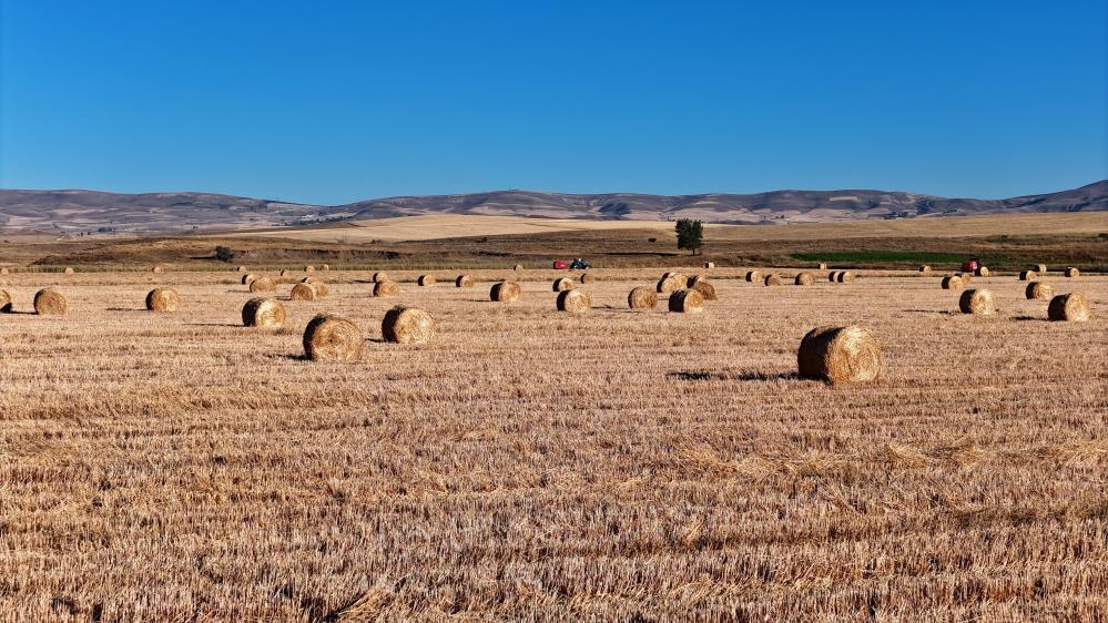 Sivas'ta TİGEM'e ait yem bitkisi tarlalarında tamamlanan hasadın ardından balya çalışmaları başladı. Biçerdöverlerin bıraktığı bitki sapları, traktörlerin arkasındaki balya makinaları ile rulo haline dönüştürüldü. Hayvanların kış boyunca yiyecek ihtiyacını karşılamak için hazırlanan rulo balyalar, ilginç görüntüler oluşturdu.