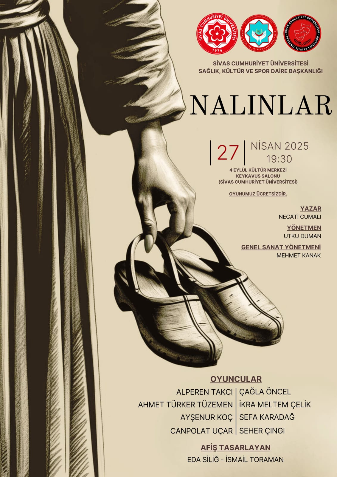 Sivas Cumhuriyet Üniversitesi Sağlık, Kültür ve Spor Daire Başkanlığı, tiyatro severleri heyecanlandıran bir etkinliğe ev sahipliği yapıyor. Necati Çumalı’nın unutulmaz eseri Nalınlar, 27 Nisan 2025 tarihinde saat 19:30’da 4 Eylül Kültür Merkezi Keykavus Salonu’nda izleyiciyle buluşacak. Ütki Duman’ın yönetmenliğini üstlendiği oyunun genel sanat yönetmenliğini ise Mehmet Kanak yapıyor.