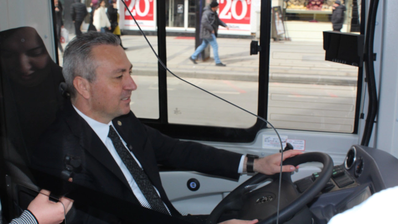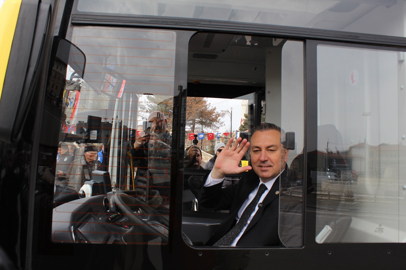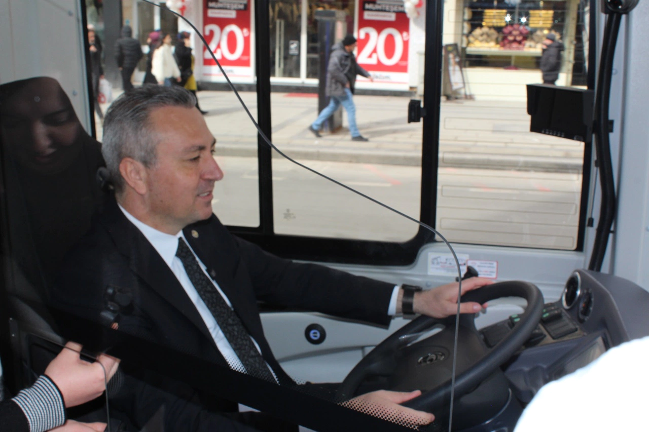 Deneme sürüşü yapılan yeni halk otobüsünün direksiyon koltuğuna geçen Sivas Belediye Başkanı Adem Uzun, vatandaşları da otobüse davet ederek sürüş yaptı.