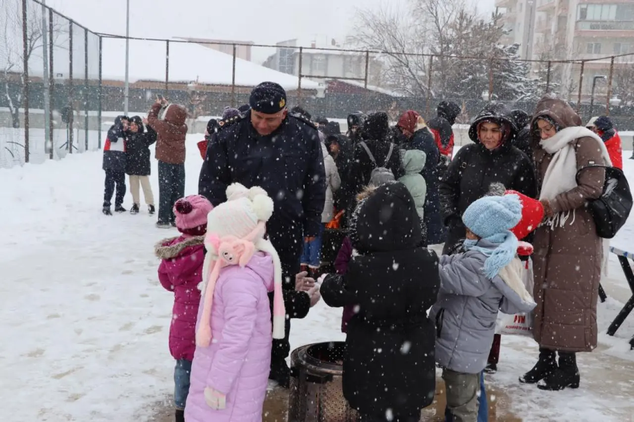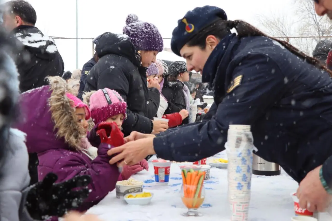 Eğlencenin dozu arttıkça acıkan miniklerin imdadına yine jandarma ekipleri yetişti. Kış denilince akla gelen ilk lezzetlerden biri olan sucuk ekmek partisi, etkinliğe tam bir şenlik havası kattı. Karlar üzerinde hazırlanan sıcak ikramlar ve yanındaki taze ayranlar, çocukların iştahını kabarttı. Soğuk havaya rağmen açık alanda hep birlikte yenen yemek, dayanışmanın ve paylaşmanın en güzel örneğini sergiledi.