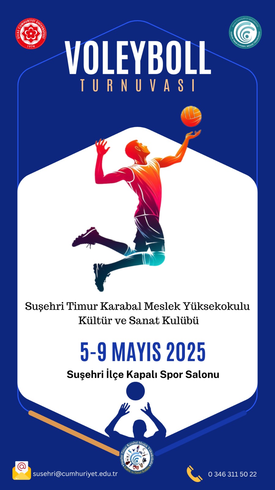 Sivas Cumhuriyet Üniversitesi Suşehri Timur Karabal Meslek Yüksekokulu Kültür ve Sanat Kulübü tarafından organize edilen voleybol turnuvası, 5-9 Mayıs 2025 tarihleri arasında gerçekleştirilecek.