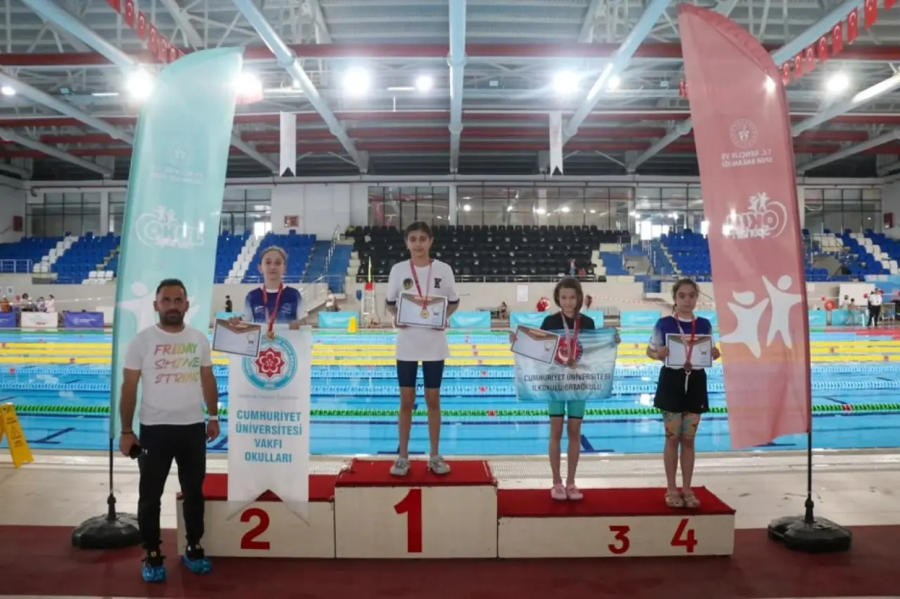 Küçük yaş kategorisindeki sporcular, hem okullarını hem de antrenörlerini gururlandırmak için kulaç attı. Havuzda yaşanan çekişmeli anlar, izleyenlerden alkış aldı.