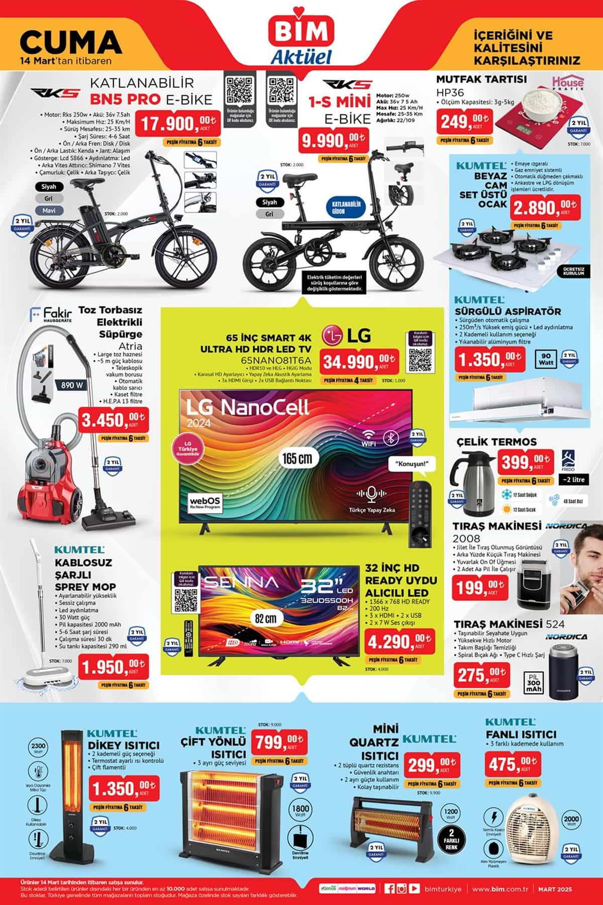 Öne çıkan ürünler arasında, LG 65 inç Smart 4K Ultra HD HDR Led TV 34.990 TL fiyatıyla satışa sunulacak. Daha uygun fiyatlı bir seçenek arayanlar için SENNA 32 inç HD Ready Uydu Alıcılı Led TV ise 4.290 TL’den raflardaki yerini alacak. Elektrikli bisiklet almak isteyenler için ise RKS Katlanabilir BN5 Pro E-Bike 17.900 TL, RKS 1-S Mini E-Bike ise 9.990 TL fiyatıyla dikkat çekiyor.