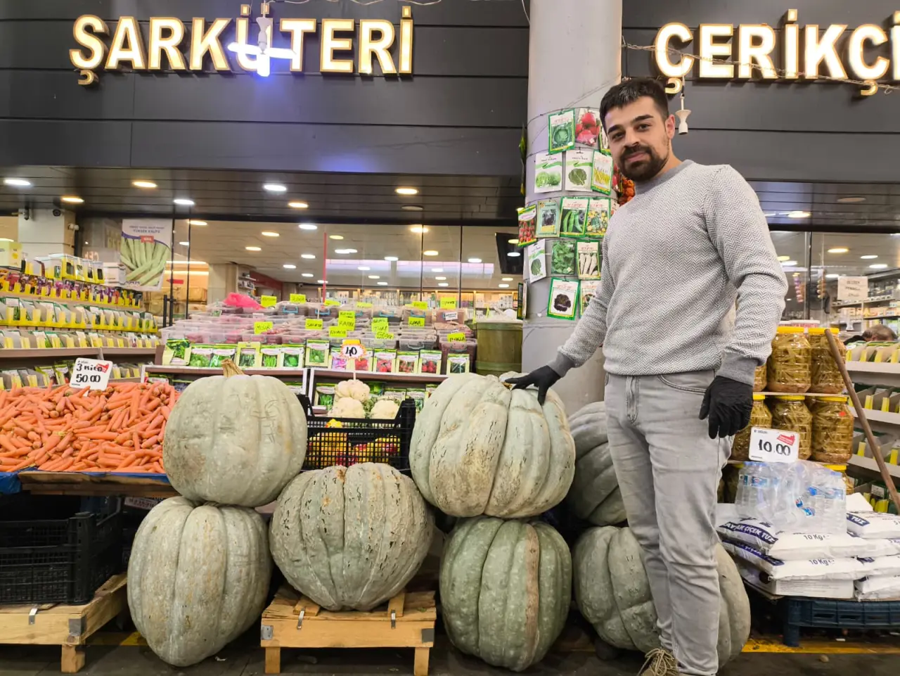 Sivas Sebze Hali'nde esnaflık yapan Kemal Çerik'in tezgahını süsleyen dev bal kabakları, alışverişe gelen vatandaşları hayrete düşürüyor. Özellikle içlerinden bir tanesi, tam 42 kilo 740 gram ağırlığıyla görenlerin gözlerine inanamadığı bir manzara sunuyor. Kilosu 40 TL'den alıcı bekleyen bu dev kabaklar, Sivas'ta kış hazırlıklarının başladığı şu günlerde yoğun ilgi görüyor. Vatandaşlar, bu sıradışı boyuttaki kabakları meraklı gözlerle inceleyip fotoğraf çekmekten kendini alamıyor.