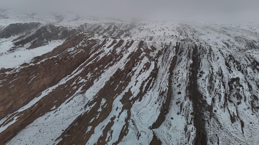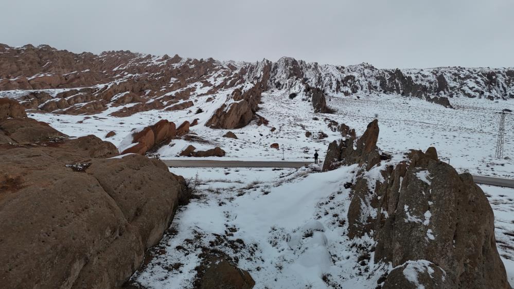Sivas'ta görünümüyle Mars gezegenini andıran ve ‘Dünyadaki Mars' olarak adlandırılan Eğribucak kayalıkları, yağan kar ile beyaza büründü.