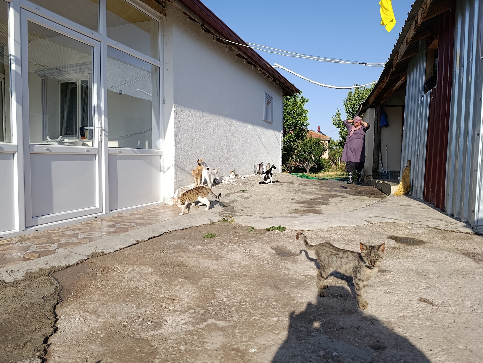 Çiftçilikle uğraşan Nazmiye Altınpınar'ın bu dokunaklı serüveni, yaklaşık 5 yıl önce kızının sahiplendiği bir sokak kedisiyle başladı. Zamanla sokağa terk edilen, yardıma muhtaç diğer kedilere de kapısını ve yüreğini açan Altınpınar, bugün 35 kedilik büyük bir ailenin her türlü bakımıyla tek başına ilgileniyor. Eşinin de ilçe merkezindeki lokantalardan getirdiği ekmek ve tavuk kırıntılarıyla kendisine destek olduğunu belirten Altınpınar, "Gelen misafirler de 'Güzel bir şey yapıyorsun.' diyerek bana yardım ediyor," dedi.