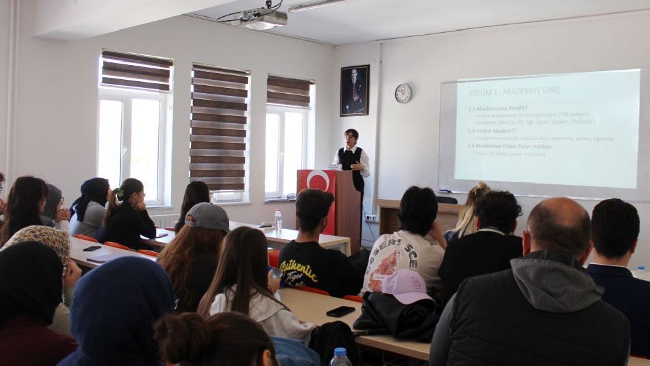 Sivas Cumhuriyet Üniversitesi Hukuk Fakültesi, öğrencilerin mezuniyet sonrası rotalarını belirlemelerine yardımcı olmak amacıyla "Mesleğin Fragmanı" serisinin üçüncü durağına ev sahipliği yaptı. Kariyer planlamasında akademiyi hedefleyen öğrenciler için düzenlenen buluşmada, Arş. Gör. Elif Yüksek Sümer tecrübelerini ve akademik dünyanın işleyişini genç hukukçularla paylaştı. Fakülte koridorlarında yankı uyandıran bu özel oturumda, kürsüye giden yolun tüm incelikleri mercek altına alındı.
