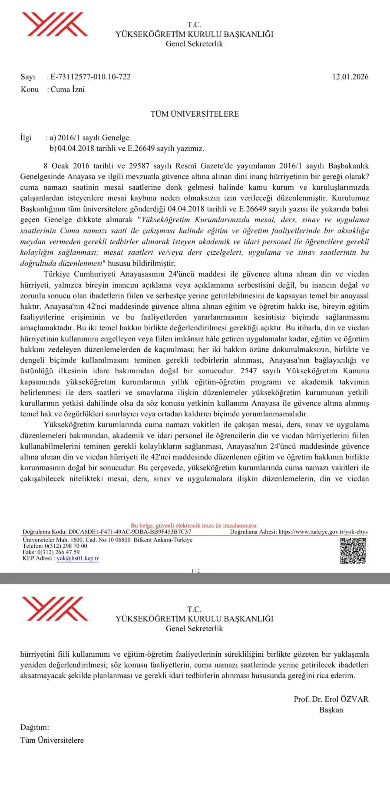 Yükseköğretim Kurulu (YÖK), üniversitelerde Cuma namazı vakitleriyle çakışan ders, sınav ve uygulama saatlerine dair önemli bir düzenlemeye imza attı. Tüm rektörlüklere gönderilen yazıda; akademik ve idari personel ile öğrencilerin ibadetlerini yerine getirebilmeleri için gerekli idari tedbirlerin alınması istendi. Kararın temelinde, Anayasa’nın 24’üncü maddesinde güvence altına alınan "din ve vicdan hürriyeti" ile 42’nci maddede düzenlenen "eğitim ve öğretim hakkının" birlikte ve dengeli bir şekilde korunması yatıyor. YÖK, üniversitelerin ders programı belirleme yetkisinin temel hak ve özgürlükleri kısıtlayıcı bir biçimde kullanılamayacağının altını çizdi.