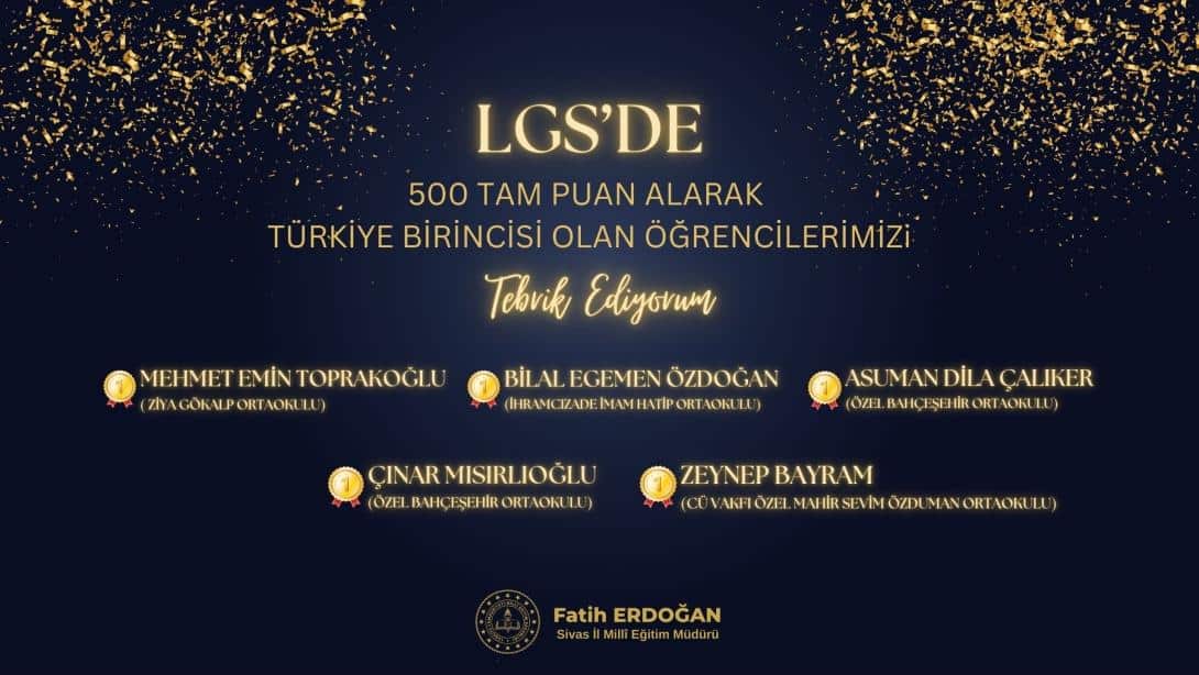 LGS sonuçlarına göre; Ziya Gökalp Ortaokulu öğrencisi Mehmet Emin Toprakoğlu, İhramcızade İmam Hatip Ortaokulu öğrencisi Bilal Egemen Özdoğan, Özel Bahçeşehir Ortaokulu öğrencisi Asuman Dila Çalıker, Özel Bahçeşehir Ortaokulu öğrencisi Çınar Mısırlıoğlu ve CÜ Vakfı Özel Mahir Sevim Özduman Ortaokulu öğrencisi Zeynep Bayram, tüm soruları doğru cevaplayarak 500 tam puan alma başarısını gösterdi.