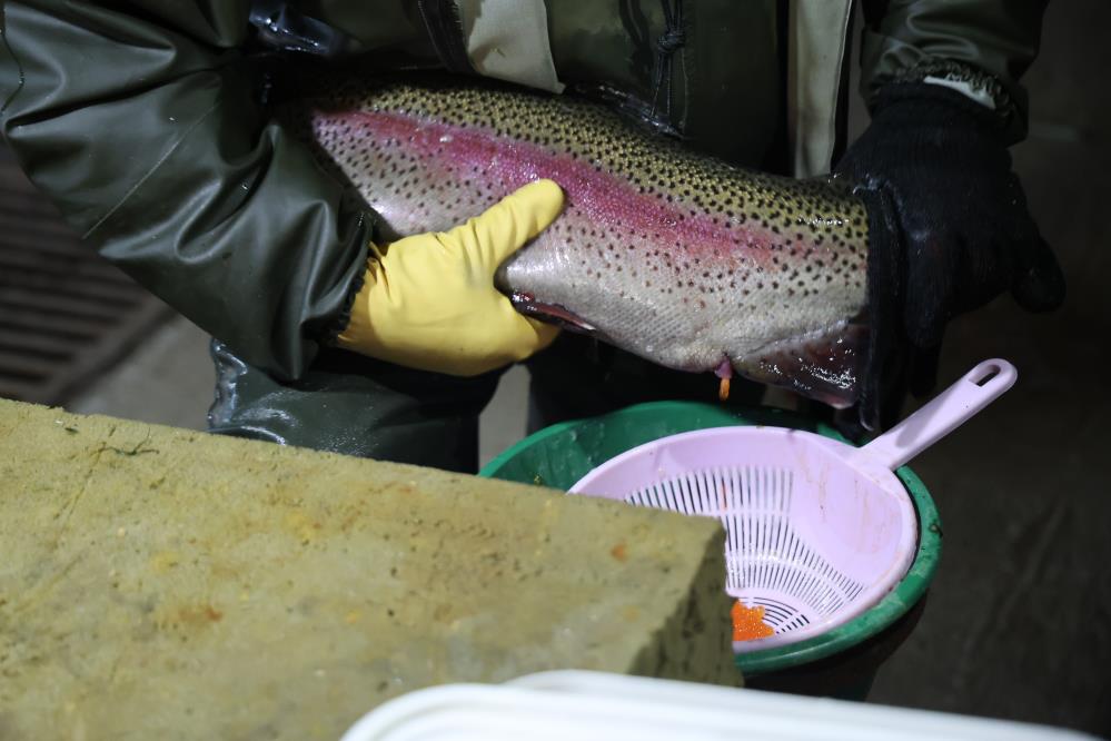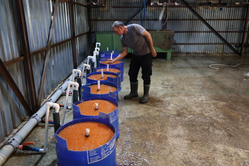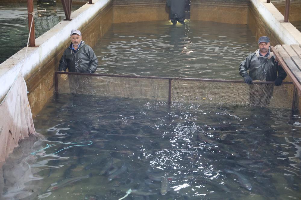 Tesiste 30 yıllık balıkçılık tecrübesiyle çalışan Birkan Karaçay, normalde yılda bir kez yapılan sağımı, kendi geliştirdikleri metotlarla yılda iki sefere çıkardıklarını belirtti. Karaçay, "Sağım işleminde yumurtaya gelmiş olan anaç balıkların seçilmesi ile işleme başlıyoruz. Bir balıktan ortalama 4 bin, 4 bin 500 yumurta elde edebiliyoruz. Balık genç ise 2 bin veya 3 bin civarında yavru alabiliyoruz" dedi.