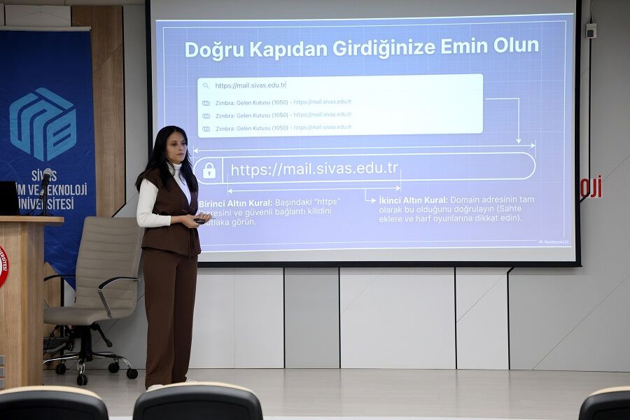 Sivas Bilim ve Teknoloji Üniversitesi’nde düzenlenen e-posta güvenliği eğitimi, dijital dünyada artan tehditlere karşı dikkat çeken uyarılara sahne oldu. Akademik ve idari personelin yanı sıra öğrencilerin de yoğun ilgi gösterdiği etkinlikte, günlük hayatta sıkça kullanılan e-posta sistemlerinin aslında ne kadar büyük riskler barındırdığı gözler önüne serildi.