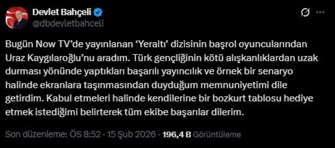 Milliyetçi Hareket Partisi (MHP) Genel Başkanı Devlet Bahçeli, televizyon dünyasında nadir rastlanan bir takdir mesajıyla gündeme oturdu. Bahçeli, Now TV ekranlarında izleyiciyle buluşan "Yeraltı" dizisinin başrol oyuncusu Uraz Kaygılaroğlu’nu bizzat arayarak, dizinin toplumsal mesajlarına dair memnuniyetini paylaştı.