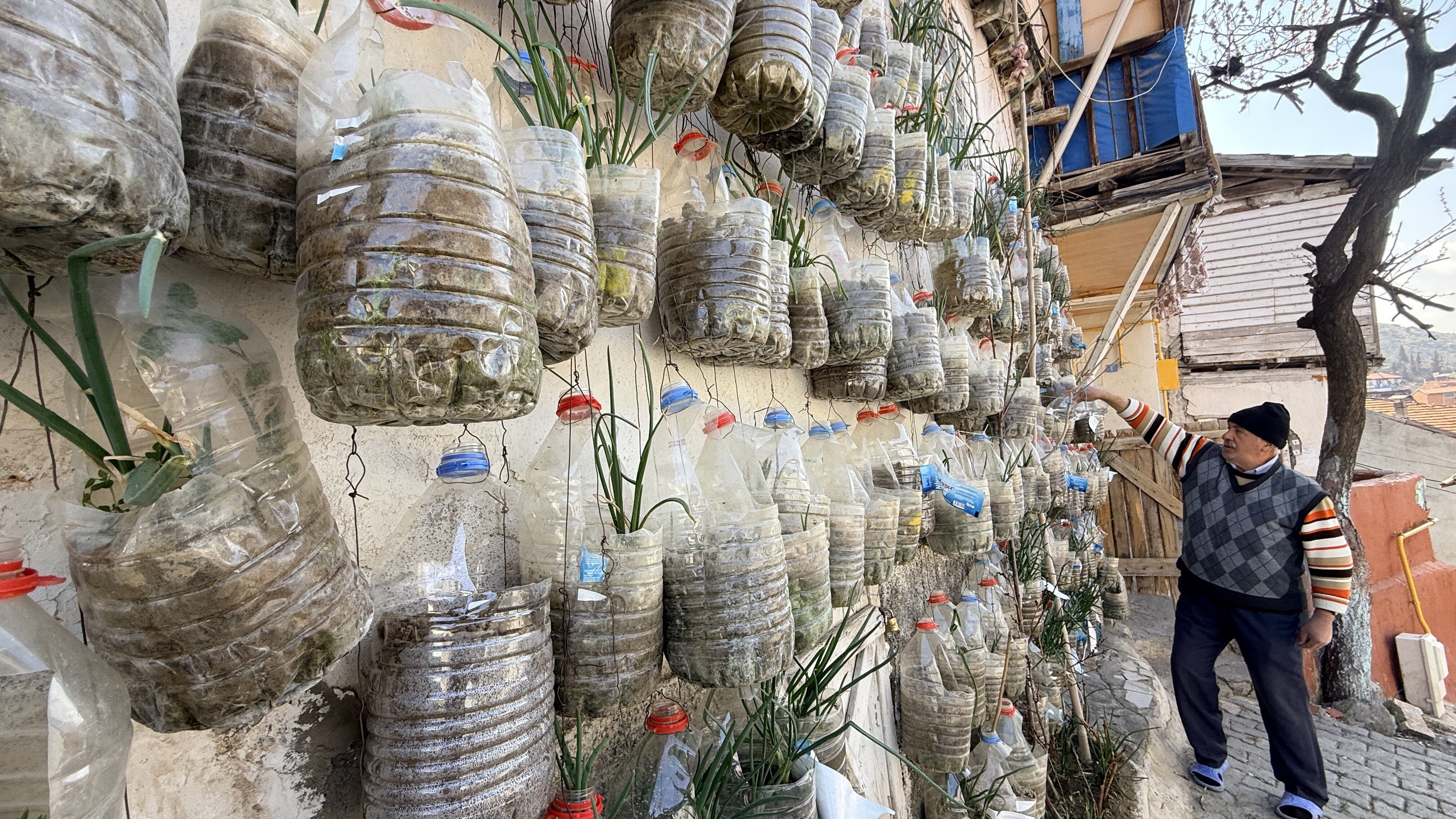 Plastik su bidonlarını saksı haline getiren vatandaş, içlerini toprakla doldurarak duvara astı. Bu yöntemle evinin dış yüzeyini adeta bir dikey bahçeye dönüştürdü. Bidonlarda yetiştirilen yeşil soğanlar, hem görüntüsüyle dikkat çekti hem de verimli bir üretim alanı oluşturdu.