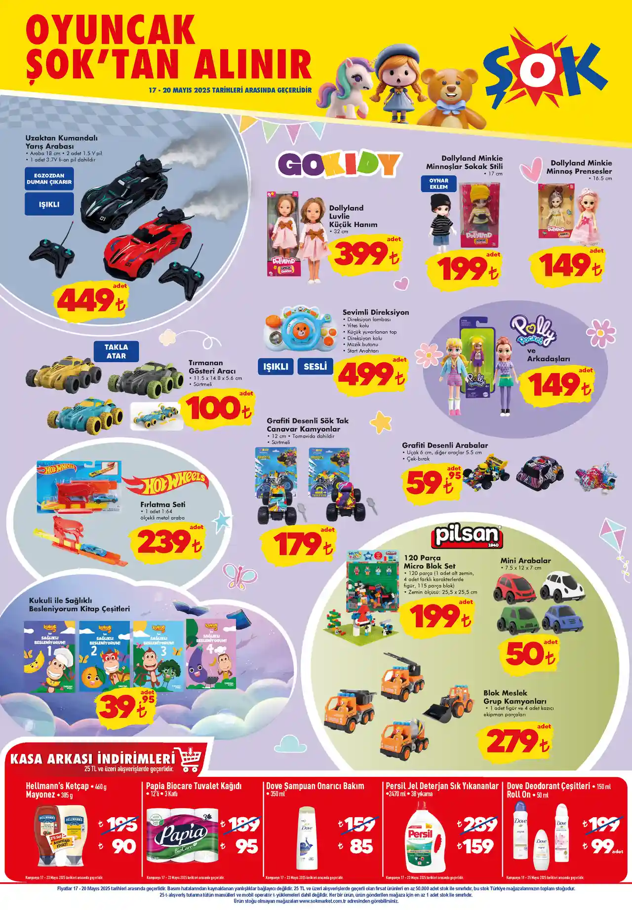 ŞOK Market, 17 Mayıs 2025 Cumartesi günü için hazırladığı tek sayfalık aktüel katalog ile dikkat çekici kampanyalara imza atıyor. Bu haftaki indirimlerde özellikle oyuncak grubu ve kasa arkası ürünlerdeki büyük indirimler öne çıkıyor. ŞOK 17 Mayıs 2025 Aktüel Kataloğu'nda tam 19 farklı ürün cazip fiyatlarla satışta olacak.