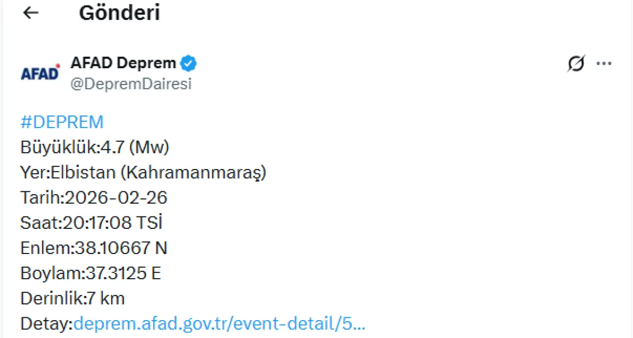 Afet ve Acil Durum Yönetimi Başkanlığı (AFAD) tarafından paylaşılan bilgilere göre deprem, 26 Şubat 2026 tarihinde saat 20.17’de kaydedildi. Yerin yaklaşık 7 kilometre derinliğinde gerçekleşen sarsıntının büyüklüğü 4,7 (Mw) olarak ölçüldü.